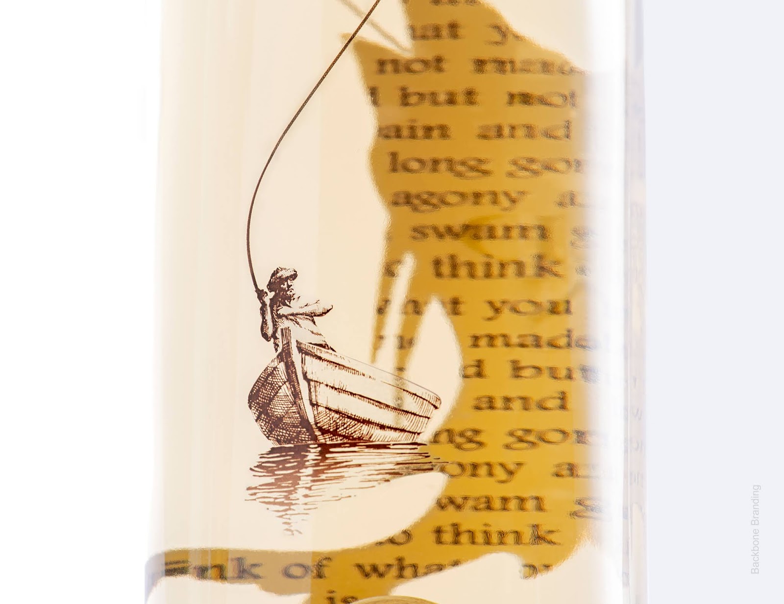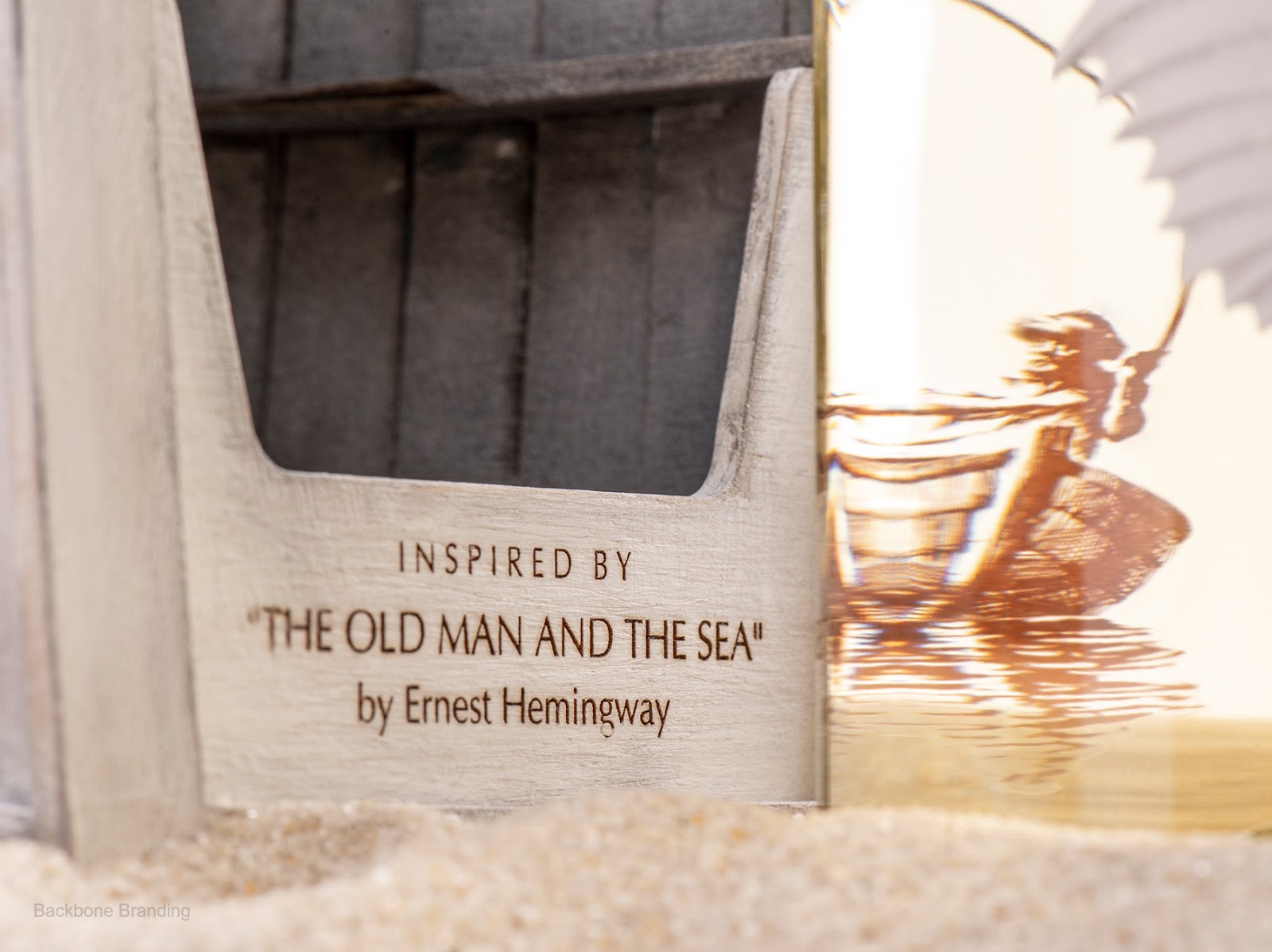 瓶子的包裝是船本身,它象征著我們每天選擇離開(kāi)公海,為值得為之奮斗的東西而奮斗。如果你從老人和他的船的側(cè)面看瓶子,你會(huì)看到馬林魚(yú)標(biāo)簽背面引用了海明威的故事。這些文本象征著克服每一個(gè)挑戰(zhàn)和困難的過(guò)程:故事造就了我們。