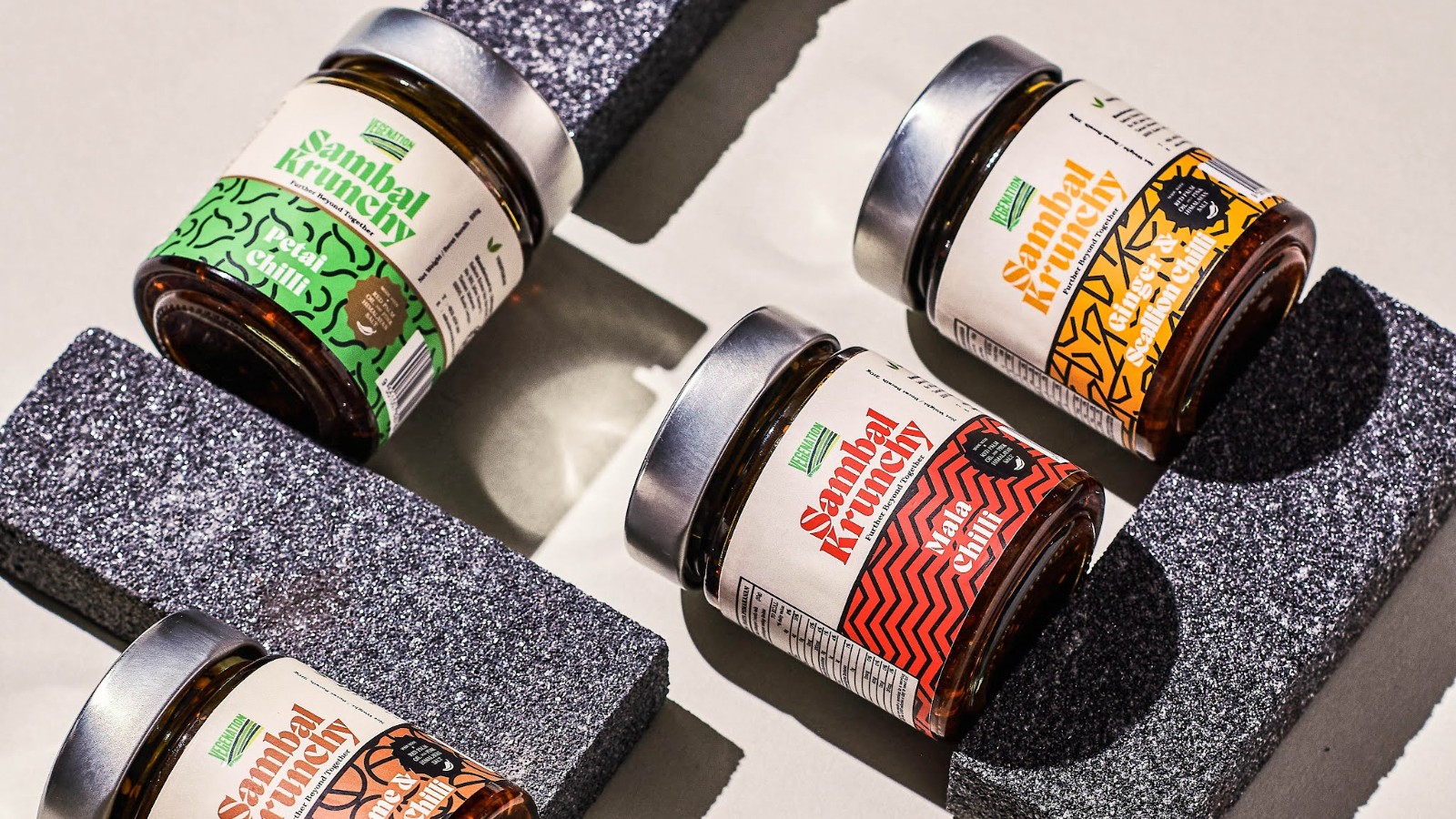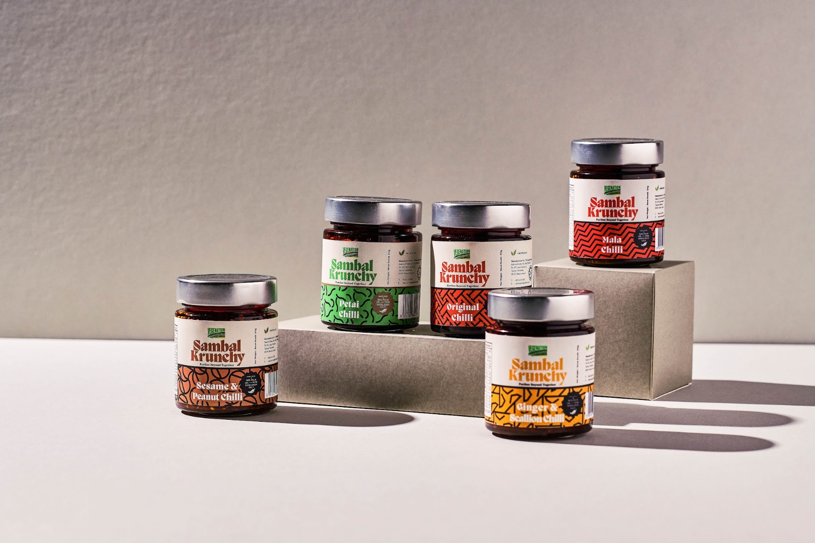 PILGRIMS BRAND STUDIO 負(fù)責(zé)為 Vegenation 設(shè)計品牌標(biāo)識和藝術(shù)指導(dǎo)。Vegenation 是一家馬來西亞有機(jī)素食公司,致力于為世界帶來美味健康的素食產(chǎn)品。受馬來西亞傳統(tǒng)蠟染圖案的啟發(fā),包裝設(shè)計師對其進(jìn)行了現(xiàn)代化和最小化,并將其轉(zhuǎn)化為大膽的圖案,以反映每種口味的味道和質(zhì)地. 鮮艷的顏色背景是根據(jù)蔬菜產(chǎn)品的顏色挑選的,它們充滿活力和色彩。我們基于這個想法為他們的第一個產(chǎn)品 Sambal Krunchy 創(chuàng)建了一系列包裝設(shè)計。
