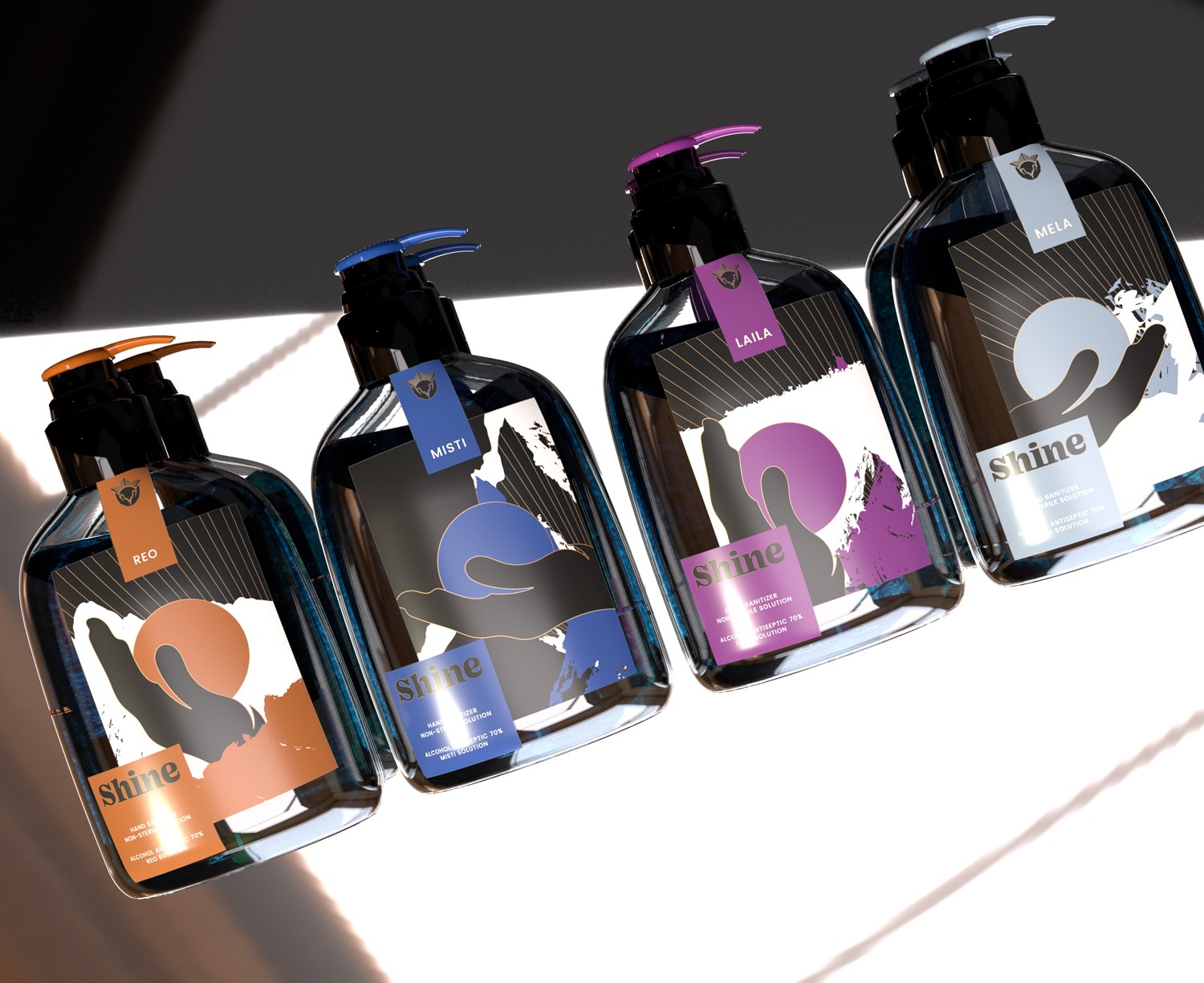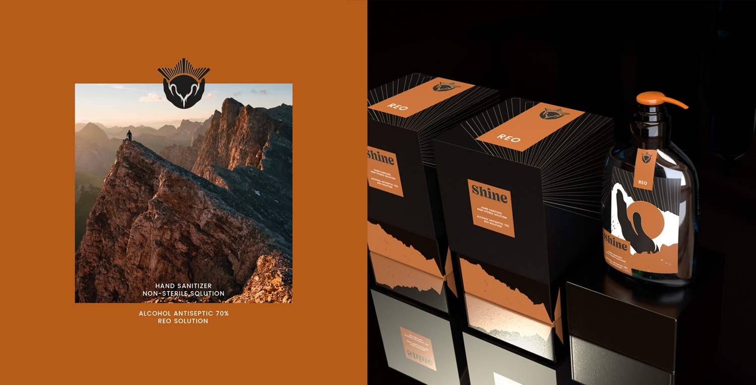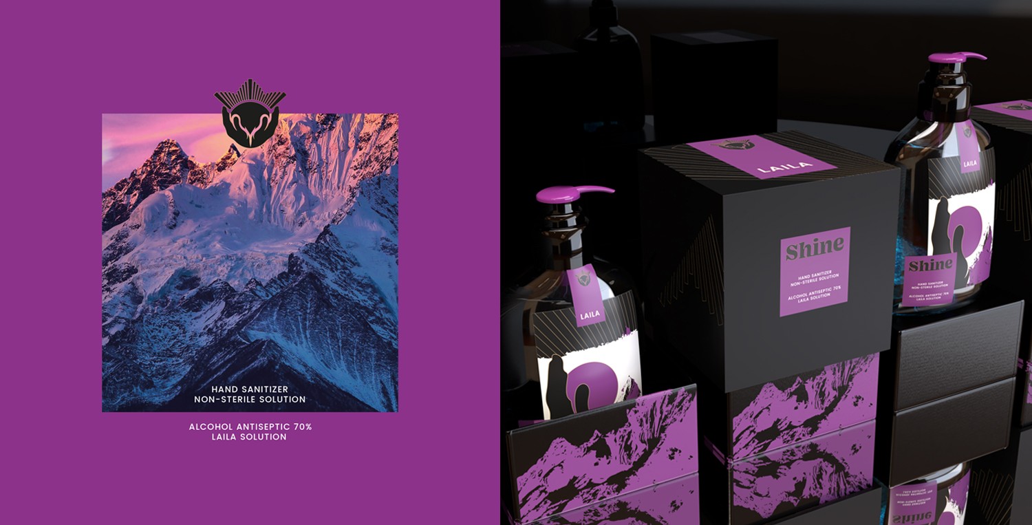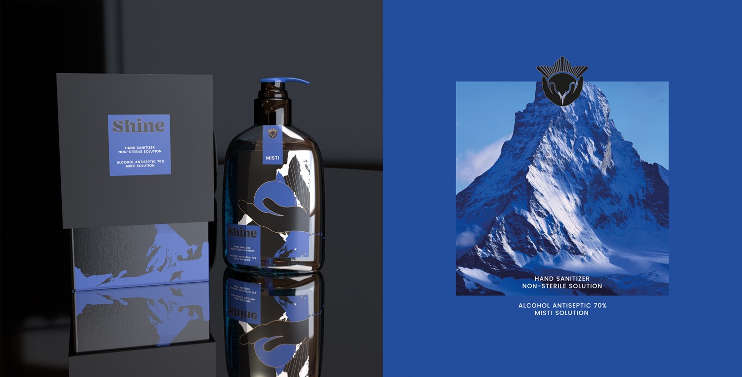 包裝背后的理念是傳達高品位的外觀和感覺,以幫助品牌在市場中閃耀。標簽設計通過展示一只伸著太陽的手(比喻在手上使用消毒劑)與不同形狀的山脈以一種抽象的方式結(jié)合,圍繞忠誠、激情和移情的品牌核心價值體現(xiàn)了品牌信息。整個產(chǎn)品的色調(diào)選擇,以喚起不同季節(jié)的陽光照射在山上的氣氛。