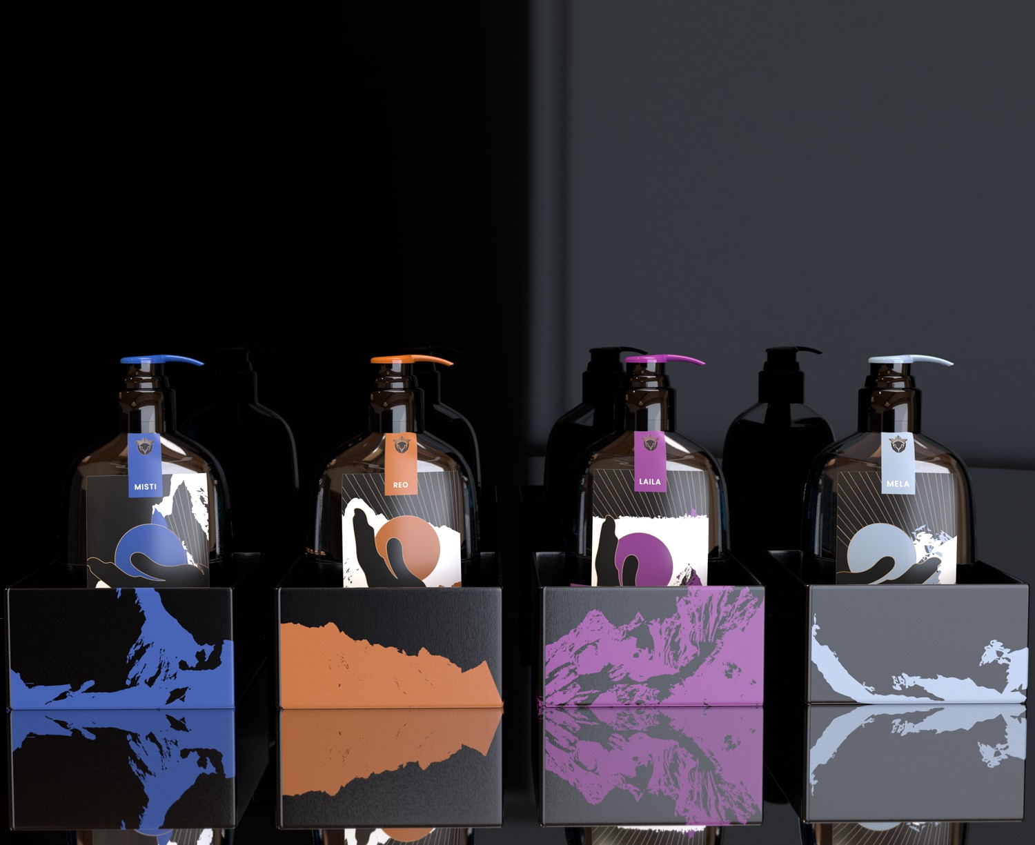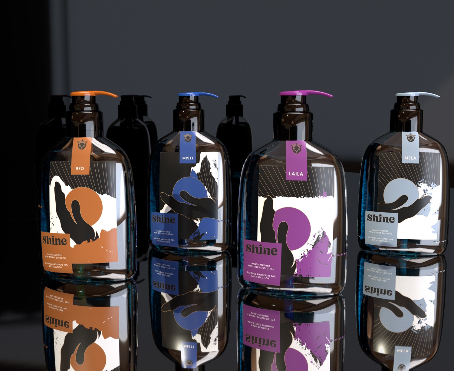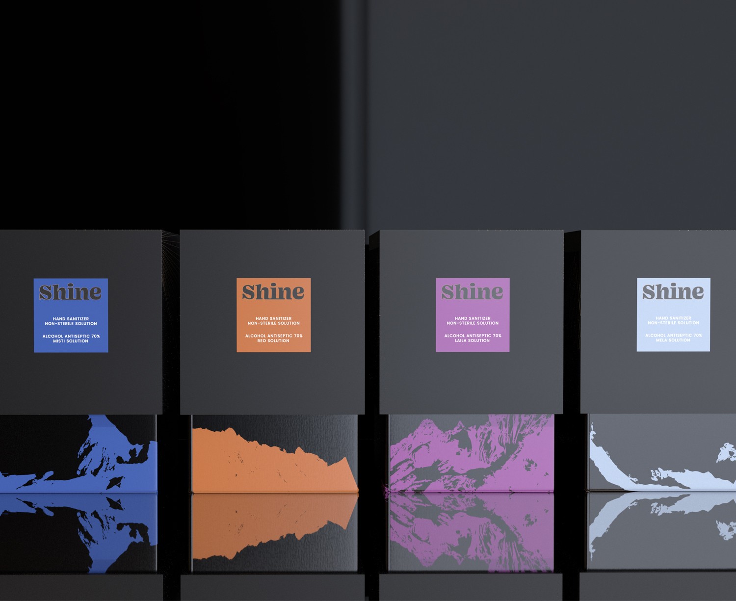 包裝背后的理念是傳達高品位的外觀和感覺,以幫助品牌在市場中閃耀。標簽設計通過展示一只伸著太陽的手(比喻在手上使用消毒劑)與不同形狀的山脈以一種抽象的方式結(jié)合,圍繞忠誠、激情和移情的品牌核心價值體現(xiàn)了品牌信息。整個產(chǎn)品的色調(diào)選擇,以喚起不同季節(jié)的陽光照射在山上的氣氛。