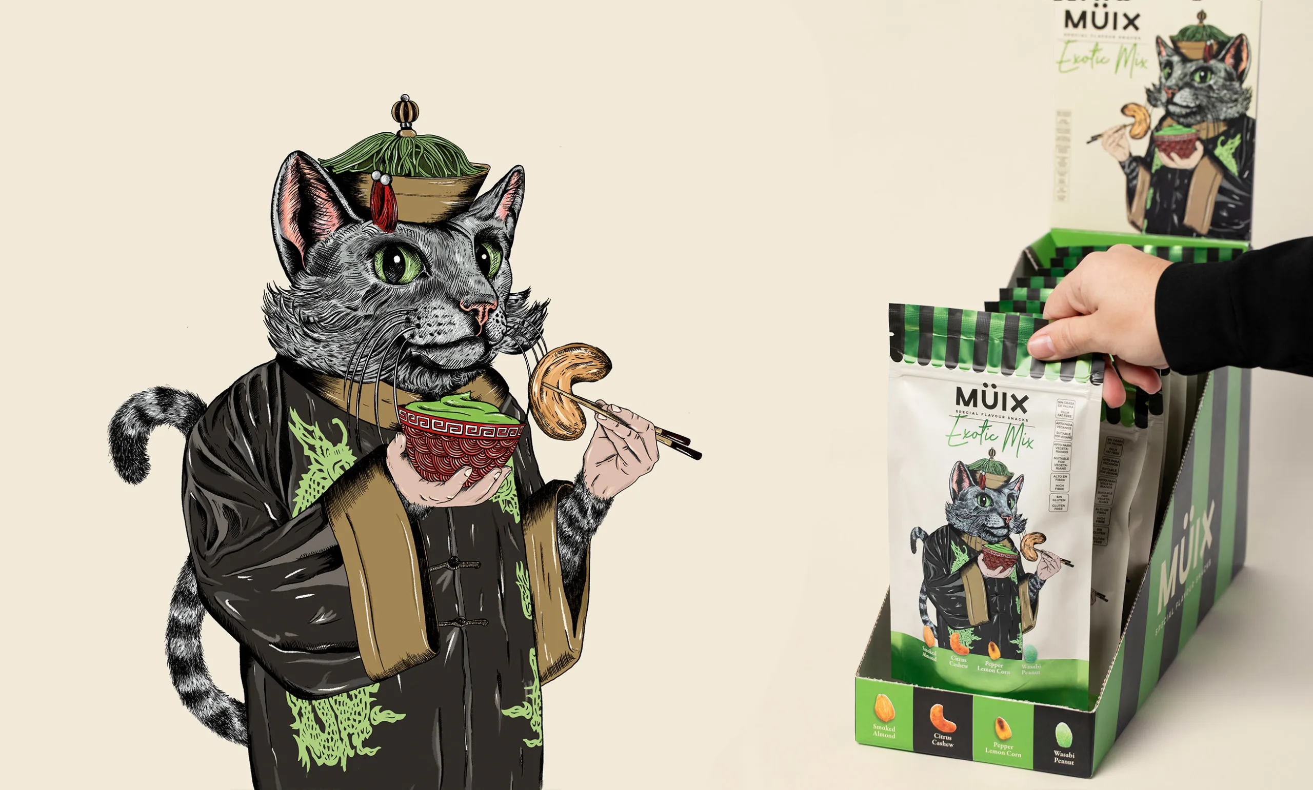 我們的包裝方案包括創(chuàng)建不同的插圖字符,以代表每種混合的特色風(fēng)味。農(nóng)民公雞為“鄉(xiāng)村混搭”,原汁原味的鄉(xiāng)村傳統(tǒng)風(fēng)味;“Yankee Mix”的棒球浣熊,美國(guó)風(fēng)味,混合了煙熏燒烤和辣椒的辛辣味道;童子軍熊的“Hunny Mix”,權(quán)力的特克斯墨西哥與甜蜜的蜂蜜,將帶我們回到童年;大師喚醒貓代表“異國(guó)情調(diào)的混合”,一次日本壽司酒吧之旅,混合了芥末、柑橘和胡椒;最后,這只獅子狗配上瑪麗·安托瓦內(nèi)特(Marie Antoinette)的“皇家混合口味”,這是一種甜而復(fù)雜的口味,將我們帶到法國(guó)競(jìng)選運(yùn)動(dòng)的糖果店,散發(fā)著橘子、開心果和蜂蜜的芳香。