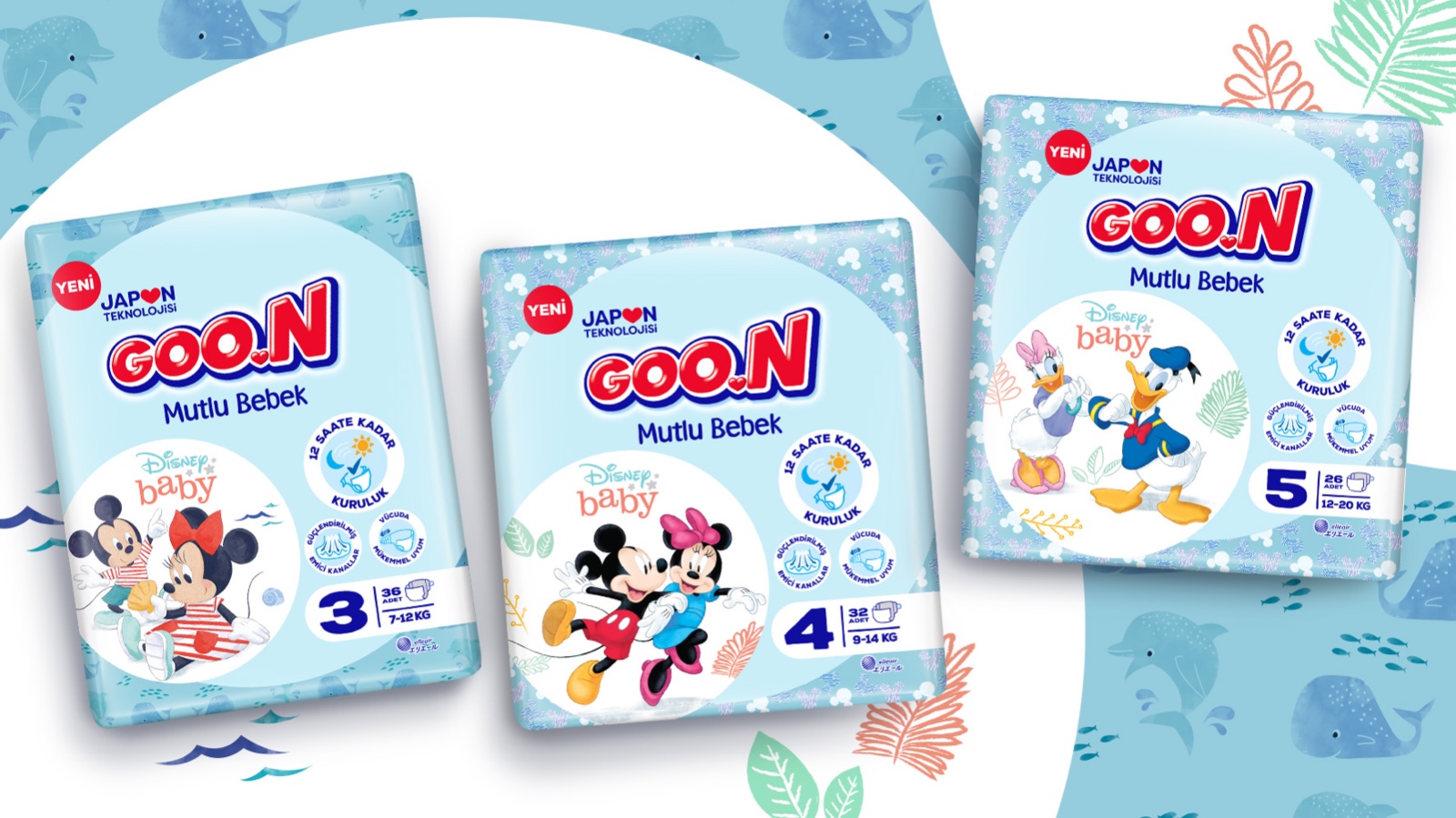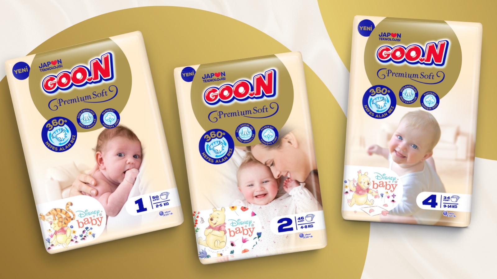 Goon 嬰兒紙尿褲有兩個子品牌:Mutlu Bebek(Happy Baby)用于標(biāo)準(zhǔn)嬰兒紙尿褲,Premium Soft 用于上段。為了給 Goon 紙尿褲創(chuàng)造一種通用的視覺語言,我們創(chuàng)建了一個圓形的品牌架構(gòu)。靈感來自標(biāo)志中 GOO 字母的圓形形式。對于 Goon Premium Soft,標(biāo)志下方的金色圓圈是建筑的主要視覺元素。金色代表品牌的高端定位。另一方面,對于 Mutlu Bebek(Happy Baby),在白色圓圈內(nèi)使用了授權(quán)的迪士尼角色,并使用了幼稚的藍(lán)色來與母親們建立更真誠的溝通。盡管圓形形式為 Goon 品牌架構(gòu)創(chuàng)造了一種共同語言,它們不同的尺寸和位置為子品牌提供了差異化。產(chǎn)品功能變成了帶有插圖的圖標(biāo),這些圖標(biāo)是專門為 Goon 品牌架構(gòu)創(chuàng)建的。