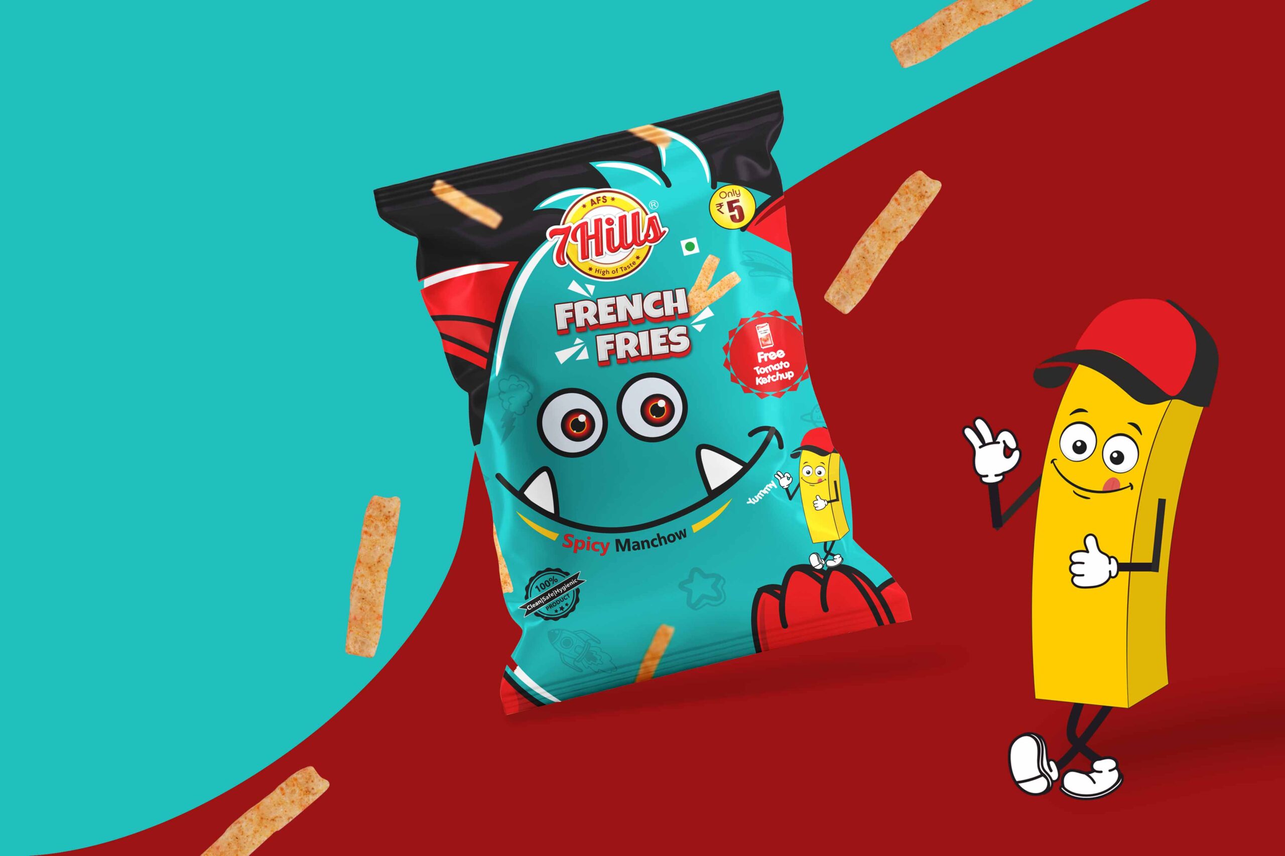 薯?xiàng)l:這包薯?xiàng)l的設(shè)計(jì)考慮到了薯?xiàng)l的辣味。包裝上的人物是一根薯?xiàng)l,戴著一頂可愛的帽子,這是通過繪畫創(chuàng)作的。這個設(shè)計(jì)的中心人物是水色的。