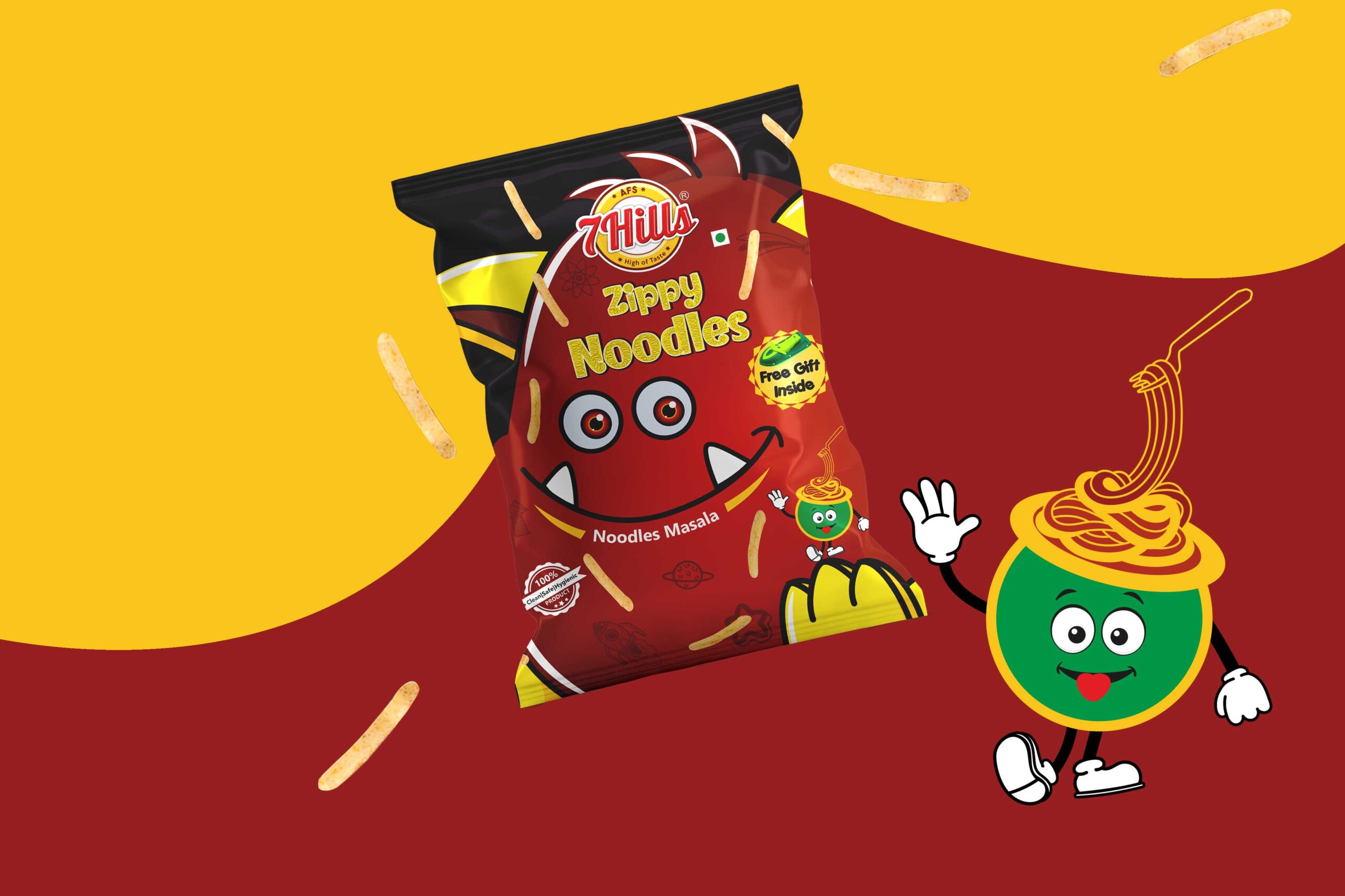 馬薩拉面:這個包裝的設(shè)計(jì)考慮了馬薩拉面的美味。包裝上的文字是一碗面條,是通過繪畫創(chuàng)作的。這個設(shè)計(jì)的中心人物是深紅色。
