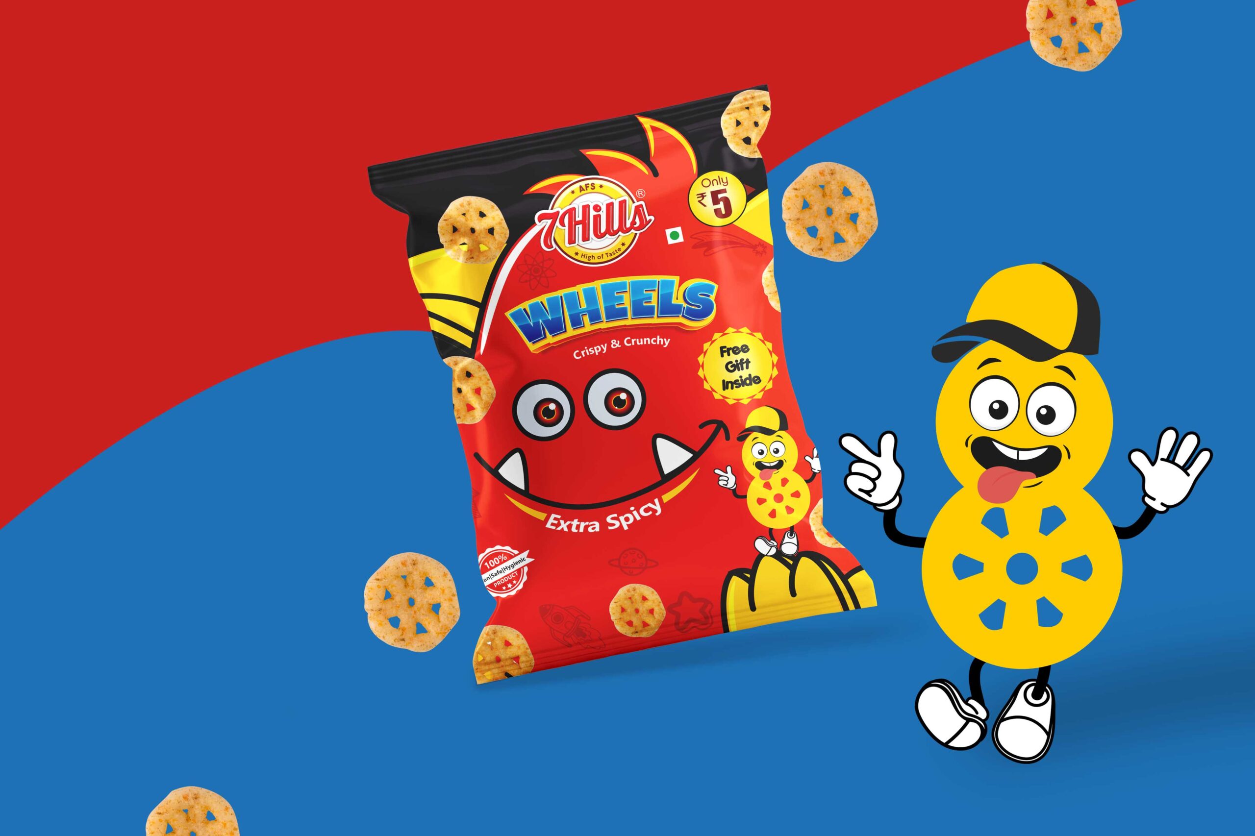辛辣車輪:這款包裝的設(shè)計(jì)考慮了辛辣口味的脆車輪。包上的字符是一個有趣的輪子字符,由繪圖創(chuàng)建。這個設(shè)計(jì)的中心人物是紅色的。由于增加了有趣的角色,這些包對孩子們來說變得更具互動性。