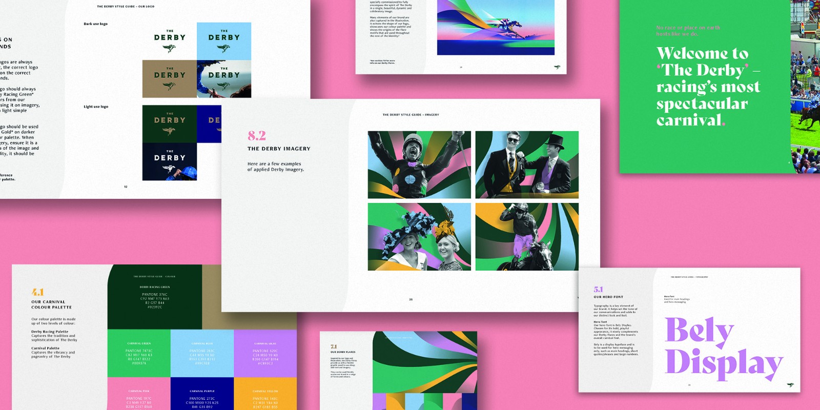 在這項(xiàng)工作的基礎(chǔ)上,我們提出了一個(gè)新的品牌主張:“賽車(chē)最壯觀的嘉年華”,以概括賽事的精英賽車(chē)血統(tǒng)與 The Hill 的嘉年華精神相結(jié)合的方式。這一主張是 The Derby 新品牌識(shí)別系統(tǒng)的核心,查理·戴維斯 (Charlie Davis) 描繪的標(biāo)志性“Derby Horse”就是例證