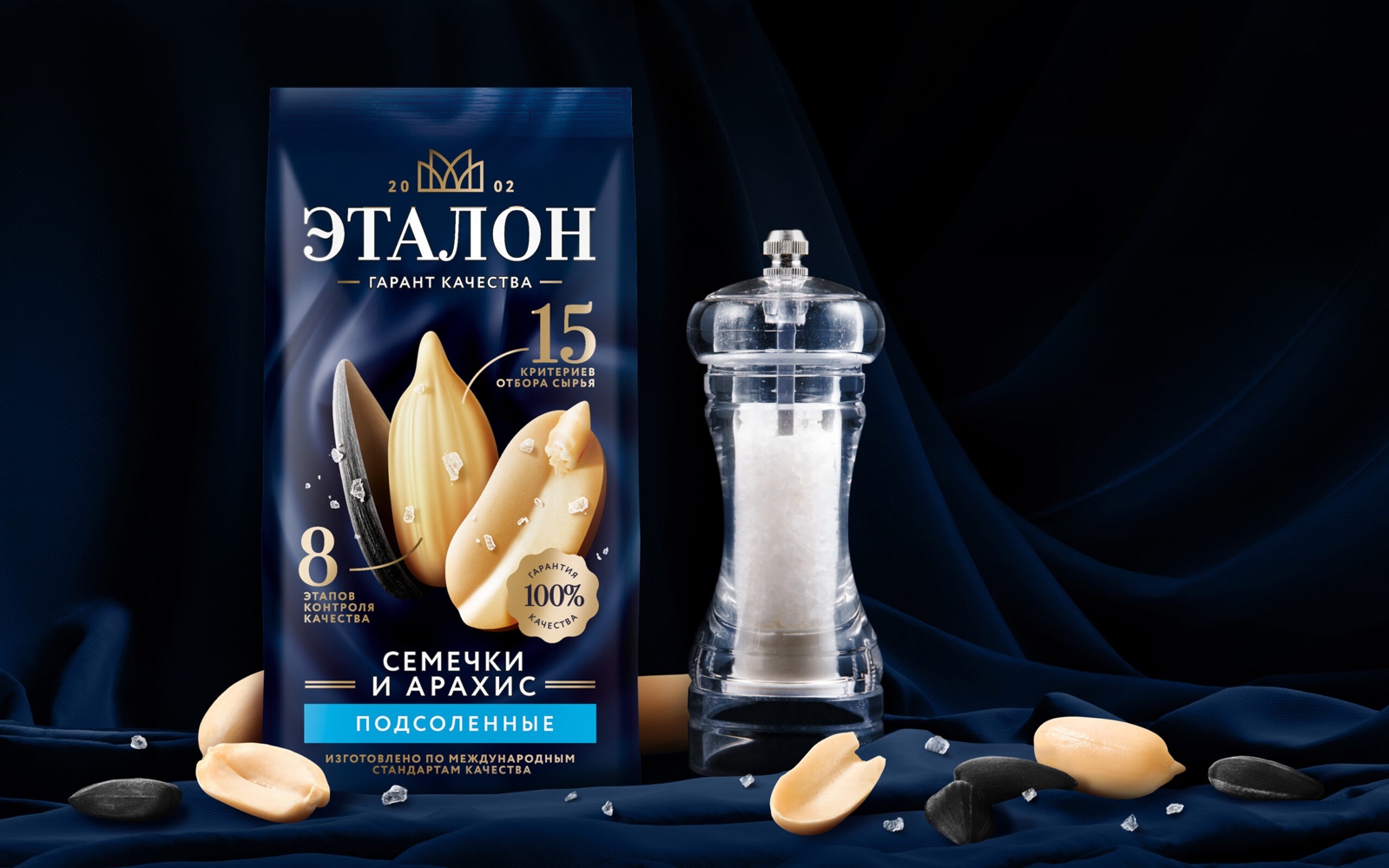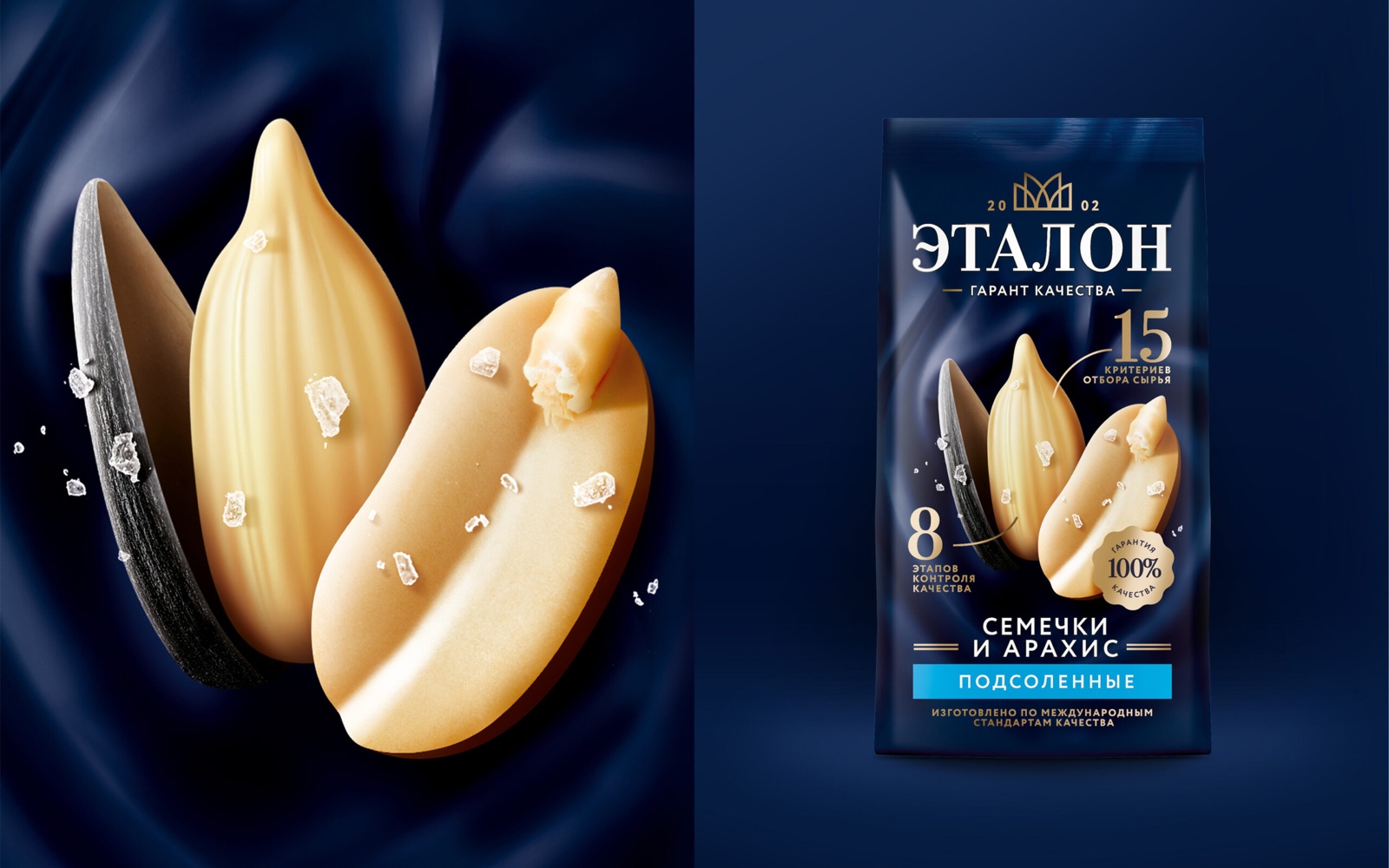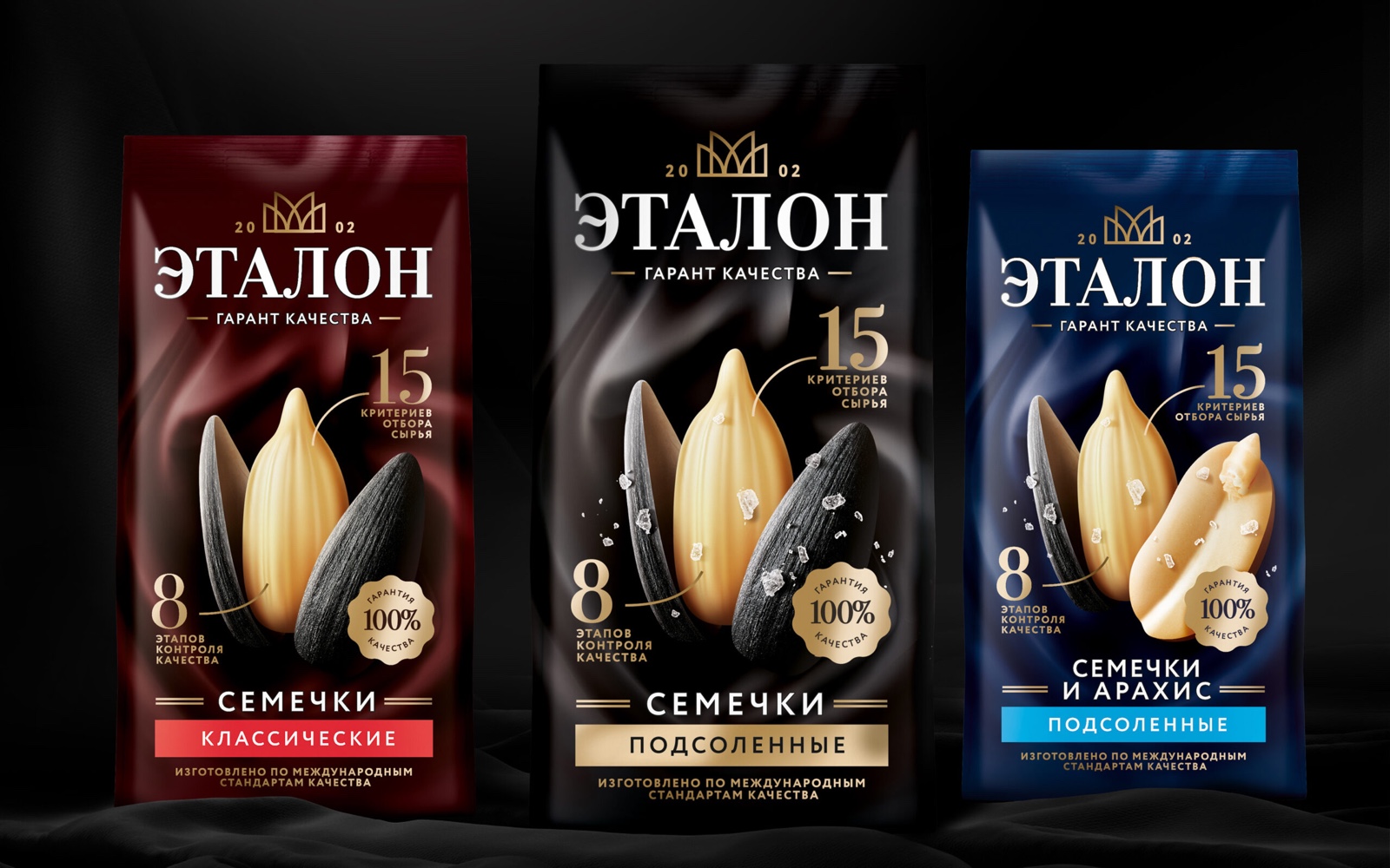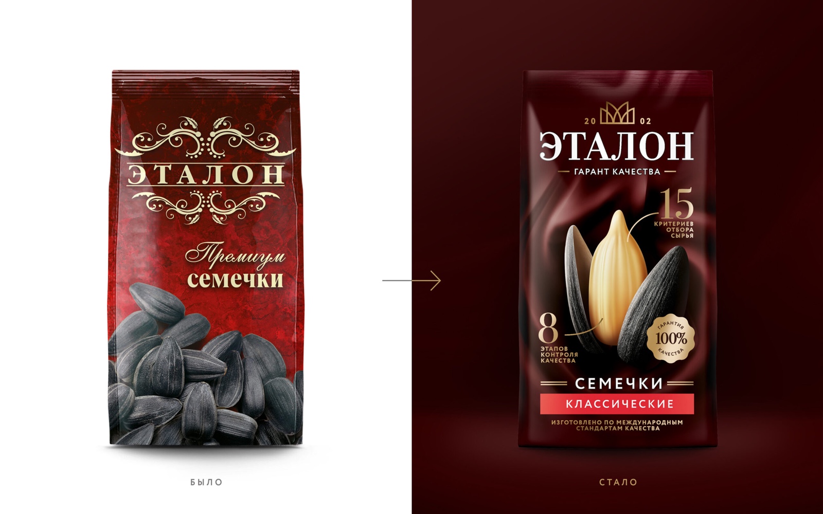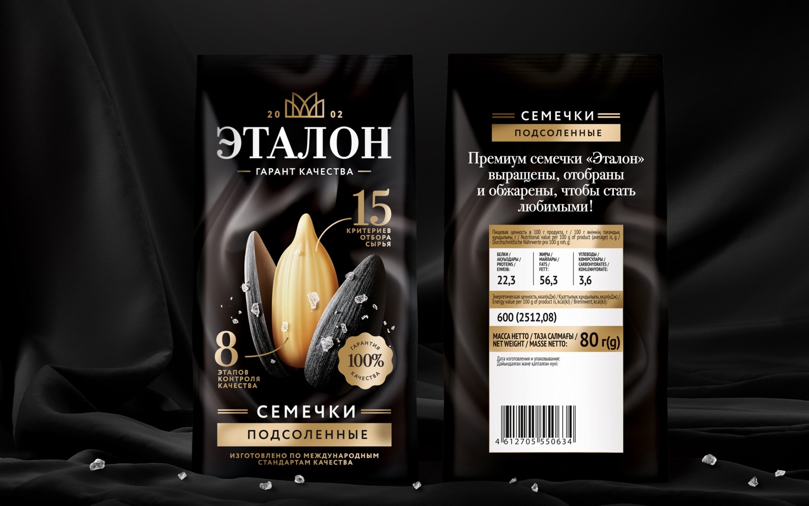 該項(xiàng)目的第一步是使用我們的三層效率方法進(jìn)行設(shè)計(jì)審核。它指出了我們需要消除的缺點(diǎn):模糊的食物區(qū),低對(duì)比度的標(biāo)志,模糊的定位,各種元素的包裝超載。像“標(biāo)準(zhǔn)具”這樣一個(gè)雄心勃勃的名字基本上沒(méi)有得到任何支持,消費(fèi)者不清楚為什么這個(gè)品牌是優(yōu)質(zhì)的。對(duì)于標(biāo)準(zhǔn)具品牌,大口徑45+的種子從最好的糖果品種中選擇。擁有自己的原料基地和種植體系、生態(tài)清潔的種植區(qū)域、獨(dú)特的烘焙和鹽漬技術(shù)——這些優(yōu)勢(shì)沒(méi)有以任何方式透露。