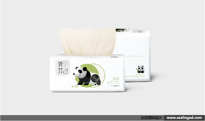 此方案簡約幾何插畫風,畫面的主體是一只幾何造型的熊貓從兩個重疊的圓形圖案里走出。綠色代表竹林,下面黃色一層是透明的,透出包裝里面的產品——竹纖維面巾紙,熊貓就好像從包裝內部走出來一樣,讓設計元素熊貓,跟產品本身有一個互動。干凈的白色調,利落的幾何熊貓造型,整潔的排版方式。很好的提升了產品的格調。