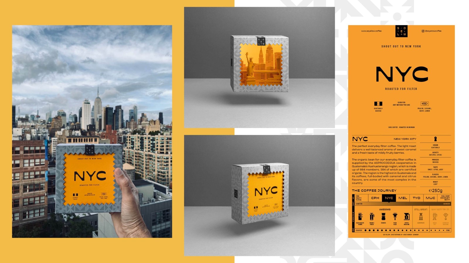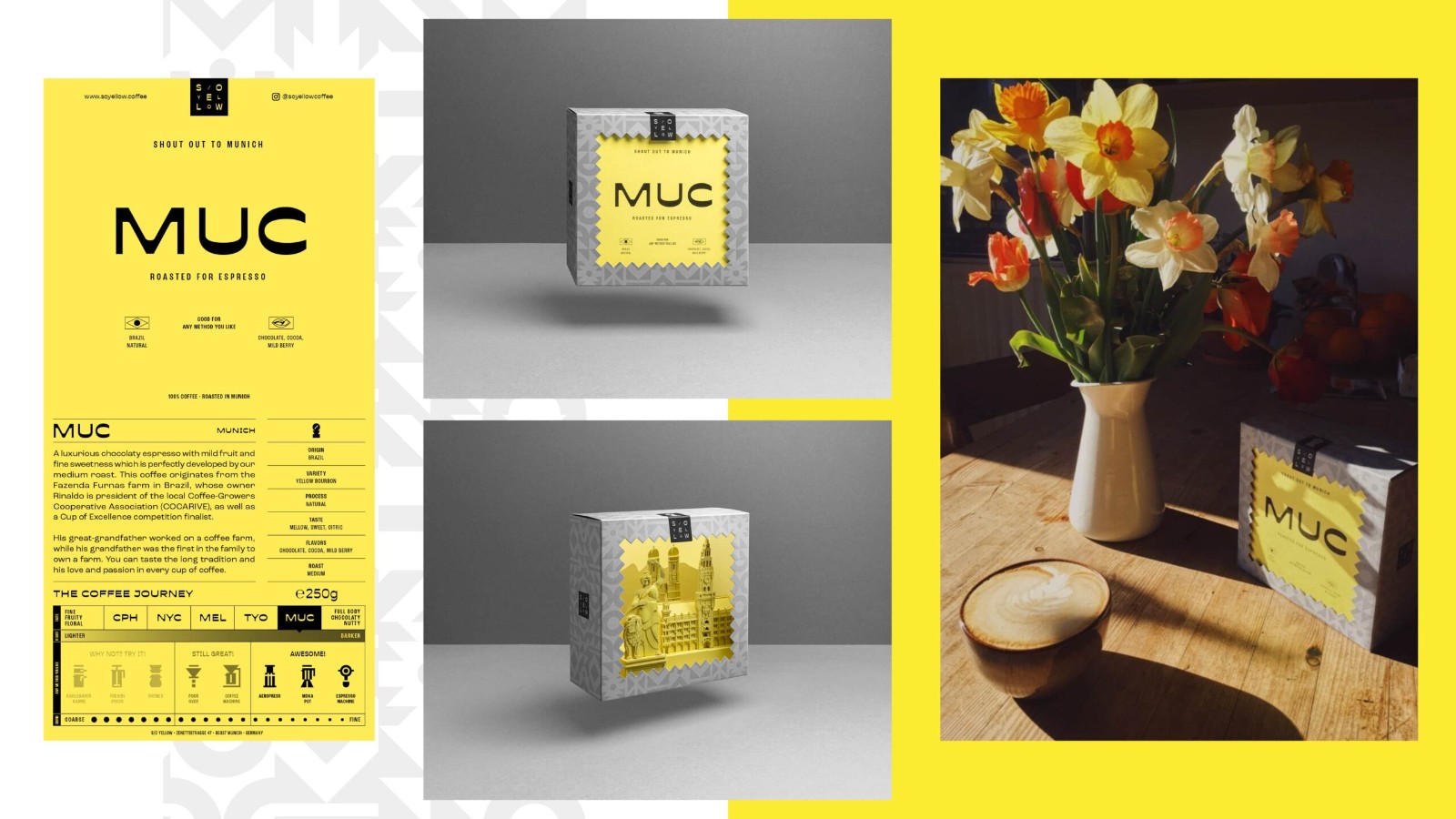 S/O YELLOW 是一家來(lái)自慕尼黑的特色咖啡烘焙公司,代表具有特殊口味的優(yōu)質(zhì)咖啡豆。通過(guò)發(fā)明“咖啡之旅”,使用不同的城市名稱(chēng),在購(gòu)買(mǎi)時(shí)提供方向和決策支持。烘焙代表了在大都市準(zhǔn)備和飲用咖啡的獨(dú)特方式。