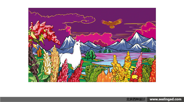 插畫整體布局采用安第斯原生態(tài)環(huán)境為背景,通過彩繪手法勾勒而成。鮮明的黃與紫的對(duì)比使畫面看起來更有沖擊力,記憶深刻。插畫元素采用安迪斯山、神鷹、駝羊、藜麥等原生態(tài)場(chǎng)景,通過遠(yuǎn)近虛實(shí)、等比對(duì)稱等繪制手法,