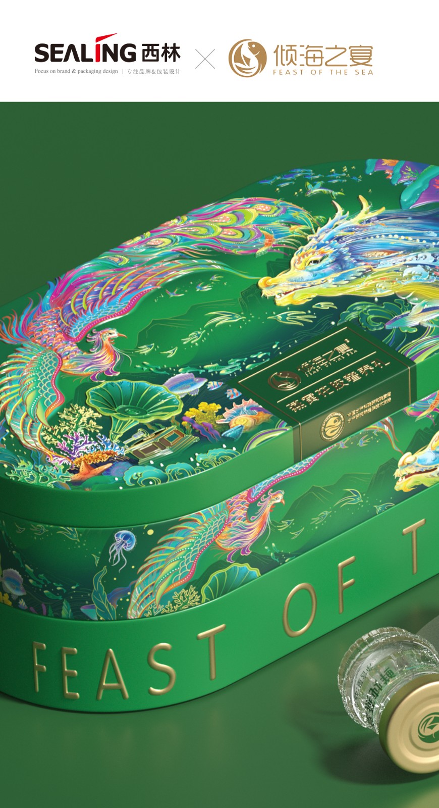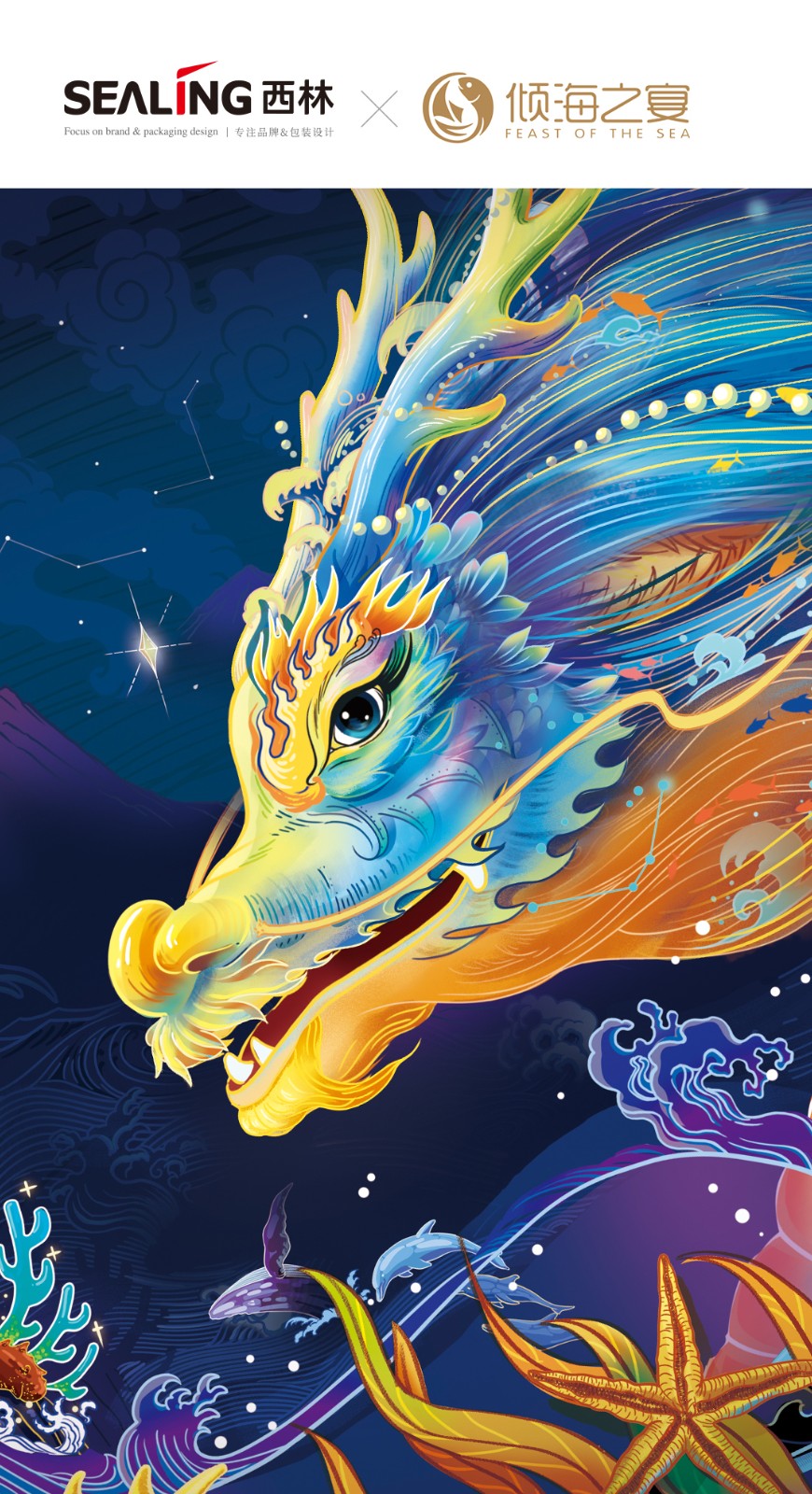 近兩年來,西林設計為傾海之宴打造的“傾海龍”超級符號,被廣泛應用在視覺傳播的種個節(jié)點上,從產(chǎn)品包裝、宣傳物料、展會、新品發(fā)布會等等,形成了良好的視覺印象,也是傾海之宴禮盒包裝設計的核心元素,它不僅具有強烈的視覺沖擊力,還承載著深厚的文化內(nèi)涵。在設計中,龍成為了這一符號的代表,這一選擇并非偶然。龍,作為中國傳統(tǒng)文化的象征,代表著力量、尊貴與吉祥,中華人都是龍的傳人。在包裝上使用龍作為超級符號,能夠迅速吸引消費者的眼球,并在情感上產(chǎn)生共鳴。這種情感鏈接有助于增強消費者對產(chǎn)品的好感,從而提高產(chǎn)品的附加值和市場競爭力。