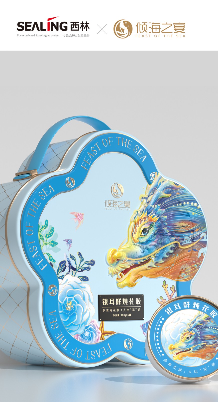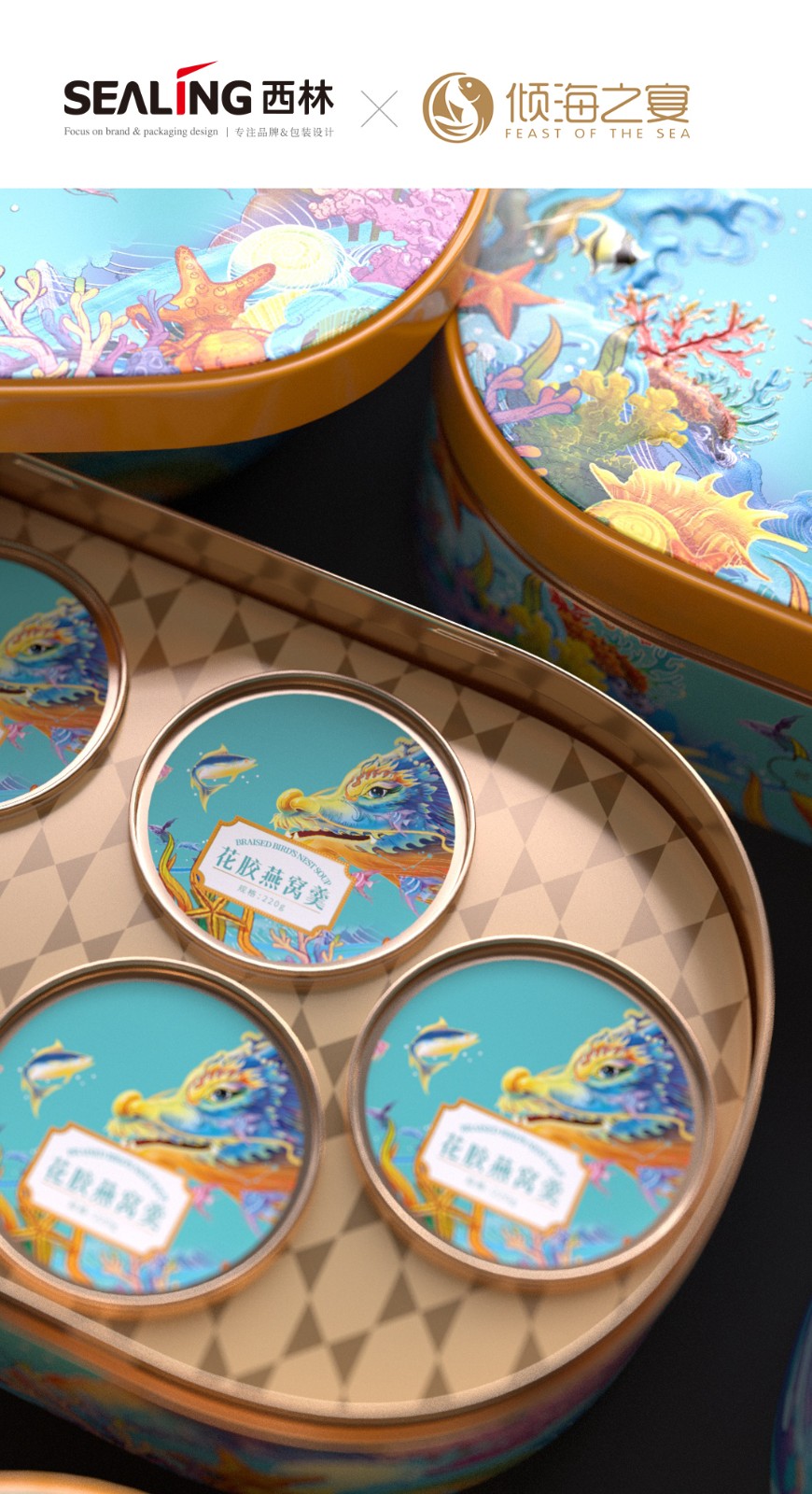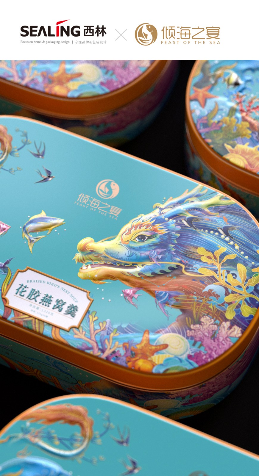 龍年來臨之際,西林設計助力傾海之宴品牌推出了全新的禮盒,包裝設計設計融入了濃厚的龍年元素和吉祥寓意,完美地展現(xiàn)了東方的美學理念,將禮盒的檔次提升到了一個新的高度。燕窩花膠奢養(yǎng)禮盒的包裝設計旨在展現(xiàn)產(chǎn)品的尊貴品質(zhì),同時融入了中國傳統(tǒng)文化元素和海洋生態(tài)元素,呈現(xiàn)出精致、創(chuàng)意和奢華的風格。西林設計為這款禮盒采用高品質(zhì)的馬口鐵盒作為外包裝,具有堅固、耐用的特點,能夠有效地保護內(nèi)部產(chǎn)品。馬口鐵盒的外觀采用質(zhì)感多色系列,給人一種時尚、高貴、典雅的感覺。