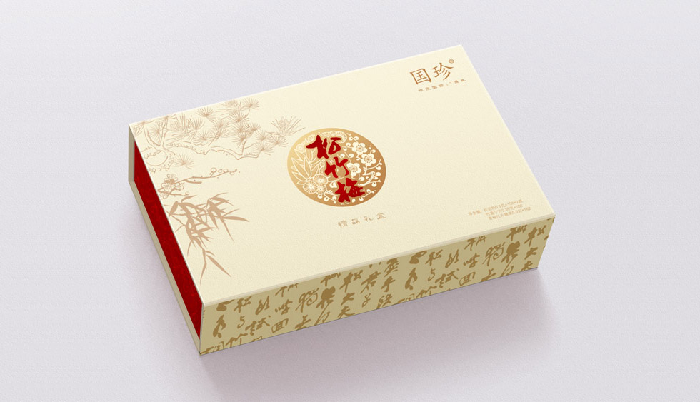 包裝以米黃色為基色,與主視覺(jué)的紅金色產(chǎn)生對(duì)比,在松竹梅圖案的裝飾下,顯得優(yōu)雅,大方。