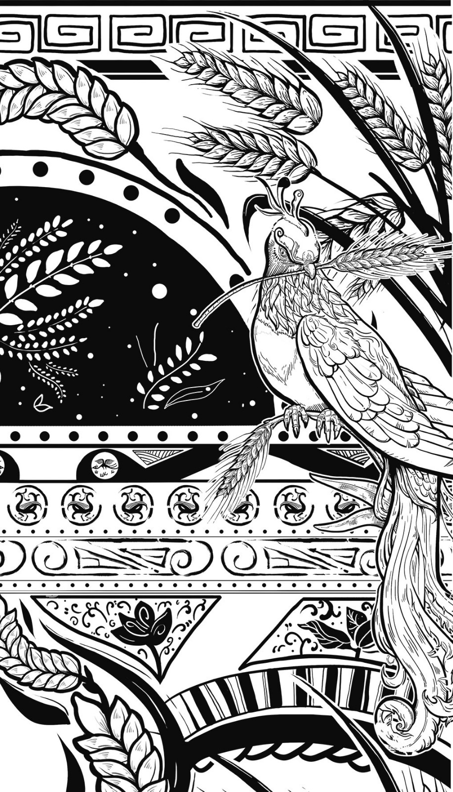 源自古老圖騰信仰的創(chuàng)意,甲骨文中“麥”源自“玄”其行如玄鳥展翅含穗而飛。《靈性甲骨》注義:“麥自天來,自古即有‘天麥雨’之稱,寓意富足豐收歡悅?!?/p>