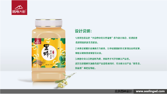 1.包裝把“大自然中的天然蜂蜜”作為設(shè)計(jì)概念,給消費(fèi)者傳遞直觀(guān)的原生態(tài)感受。