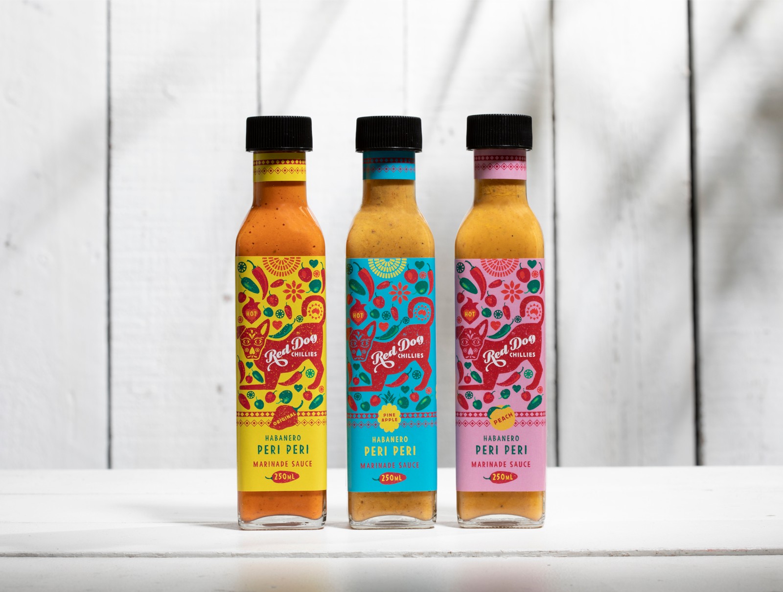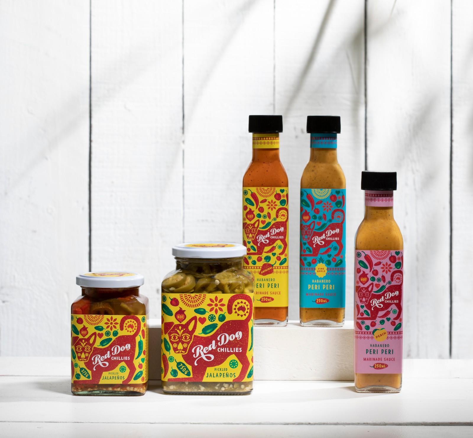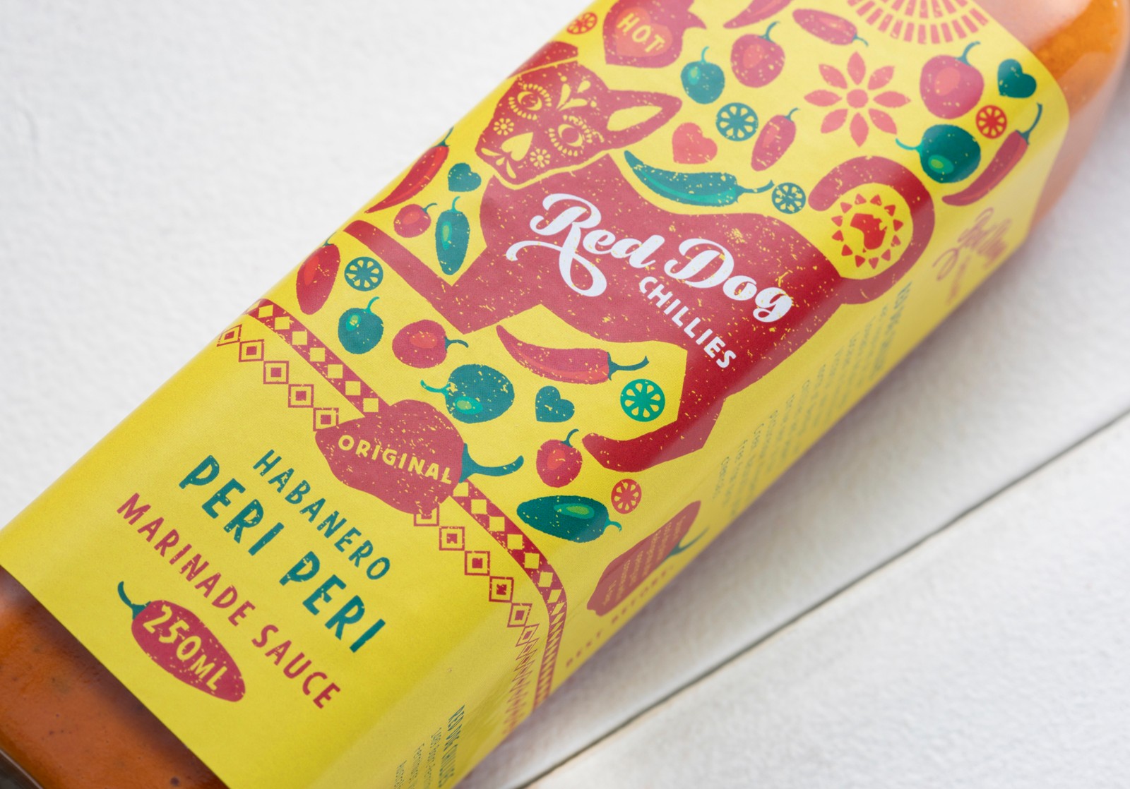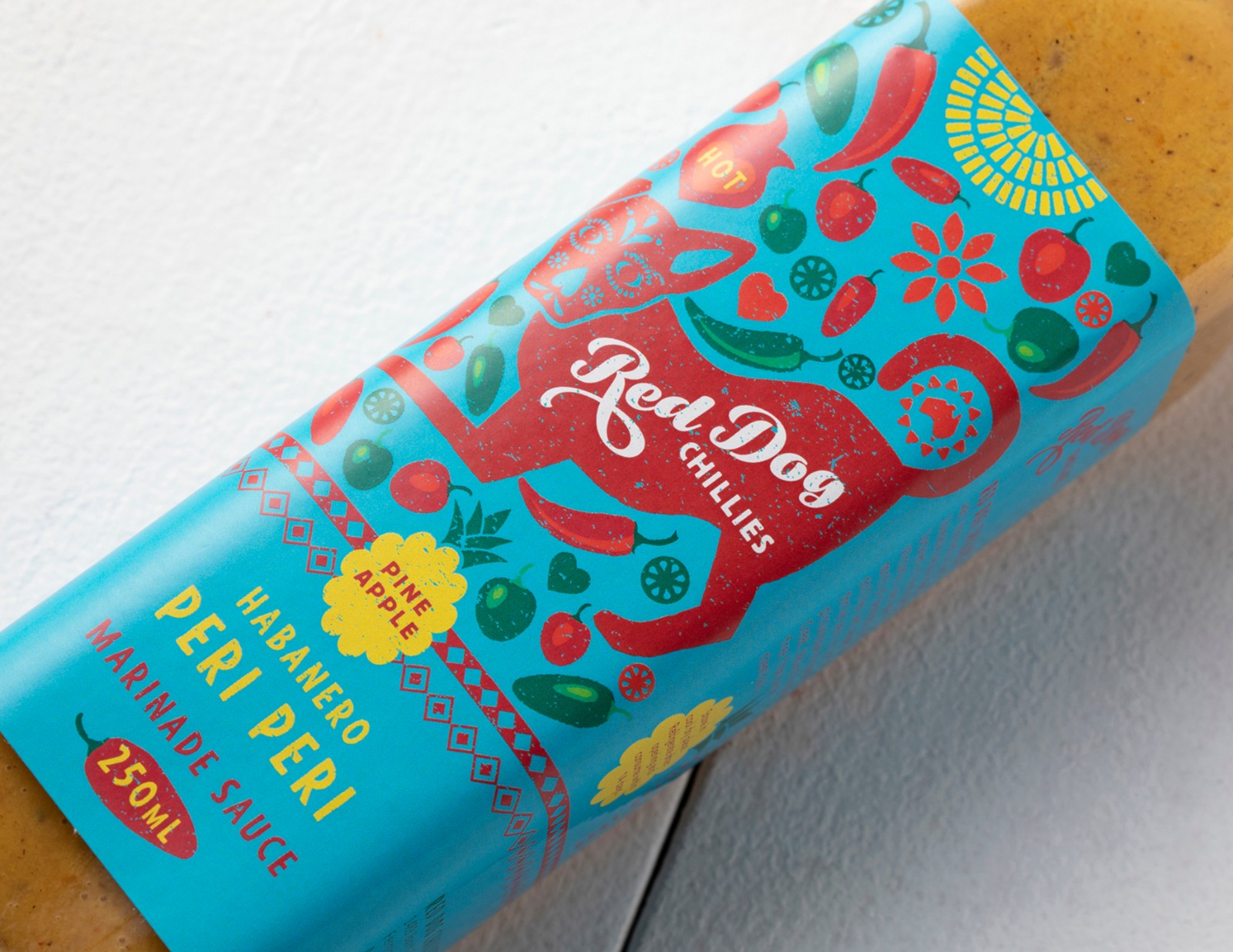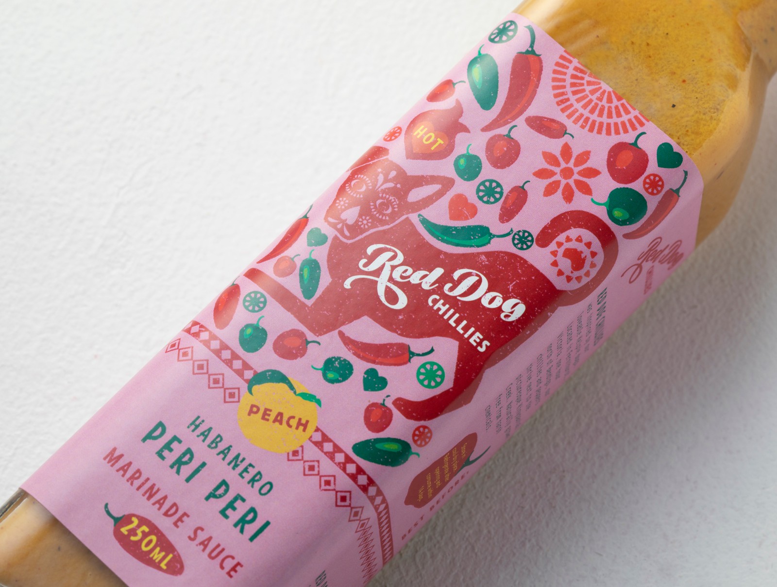 紅狗辣椒(Red Dog Chillies)需要重塑品牌,以展示其優(yōu)質產(chǎn)品并吸引新的消費者興趣。他們的老品牌并沒有傳達出店內真實,炙手可熱的美味。為了與墨西哥風味的辣醬和墨西哥胡椒保持一致,我們采用了墨西哥的“街頭食品”主題。他們心愛的“紅狗”蜿蜒在農(nóng)場周圍,在標簽上占據(jù)著中心位置。紅狗上裝飾著“死亡之日”口罩,標簽上散布著許多品種的辣椒。該標簽還有其他故事講述的圖像–太陽,這是辣椒成功生長的關鍵因素,并且以圖形方式傳達這是澳大利亞的產(chǎn)品。墨西哥設計模式增加了墨西哥主題。醬汁范圍內共有三種口味,每種口味都有不同的顏色。
