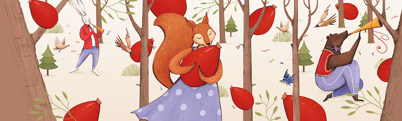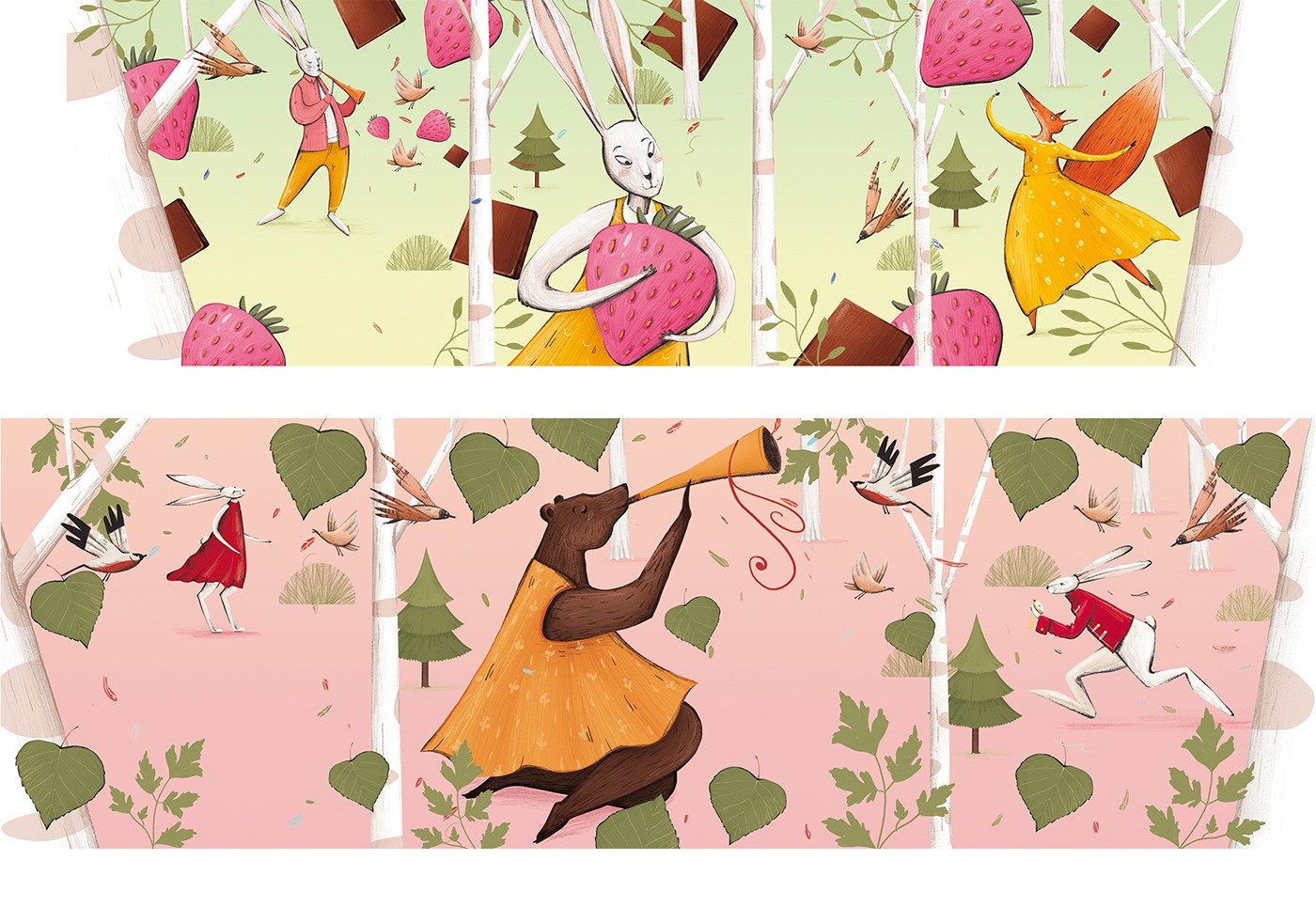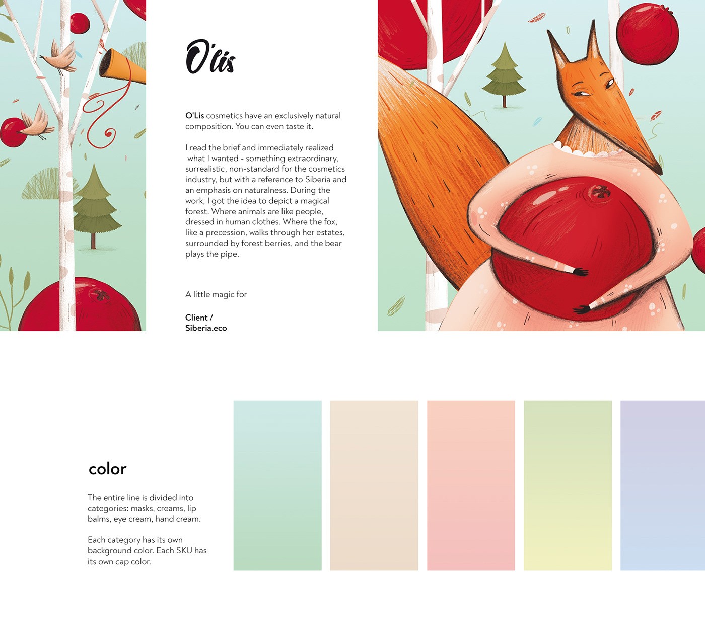 在這個(gè)設(shè)計(jì)項(xiàng)目中,我想到了要描繪一個(gè)神奇的森林。那里的動物就像人一樣,穿著人類的衣服衣服。散步穿過她的莊園森林里有漿果,熊在吹笛。