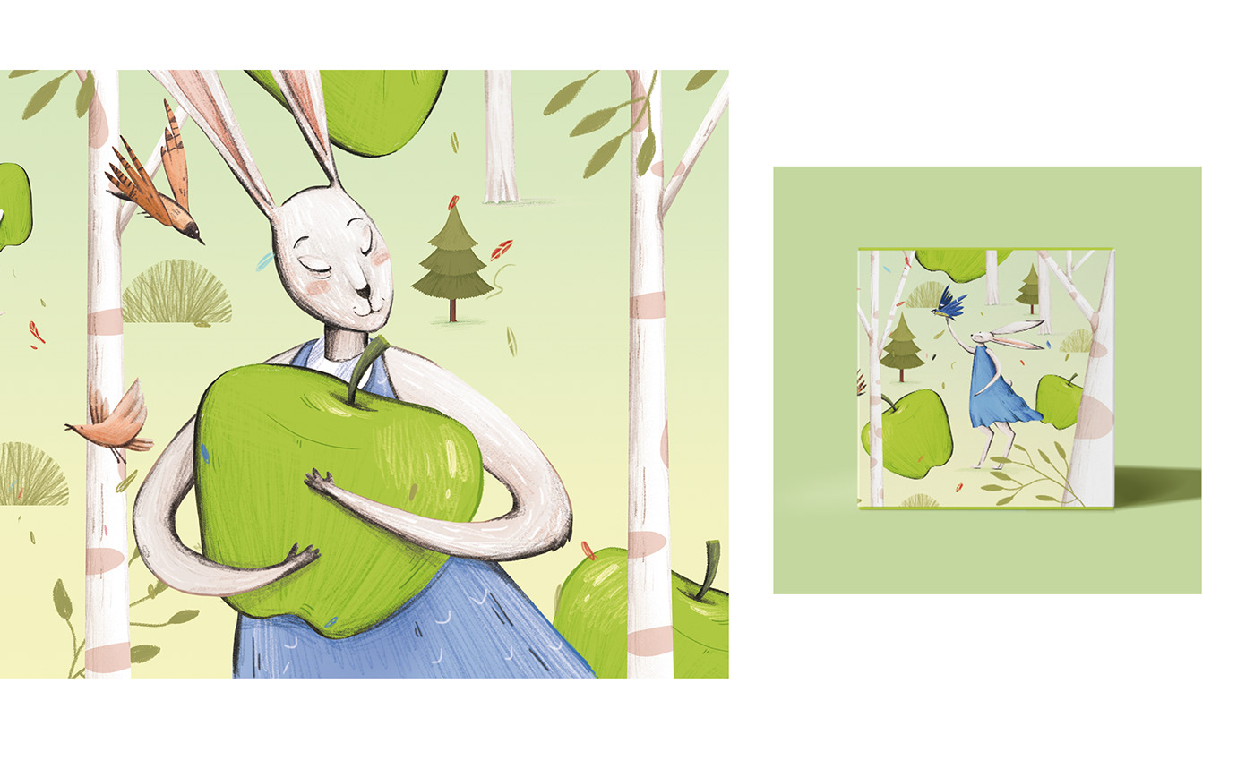 在森林中的小兔子妹妹,抱著一個(gè)大青蘋果,神態(tài)仿佛若有所思,是思念什么呢