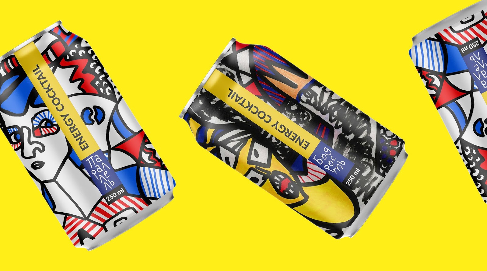 能量雞尾酒:“平行”和“快樂”。包裝設計是基于肖像畫風格的讓-杜布夫和讓-米歇爾巴斯奎特,并強調能量成分的飲料。