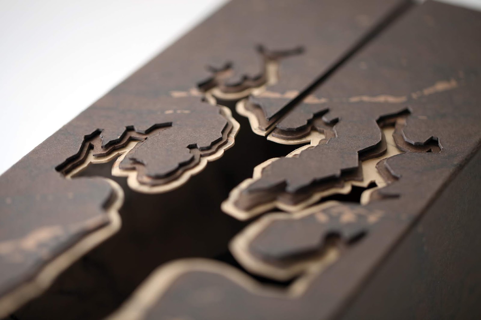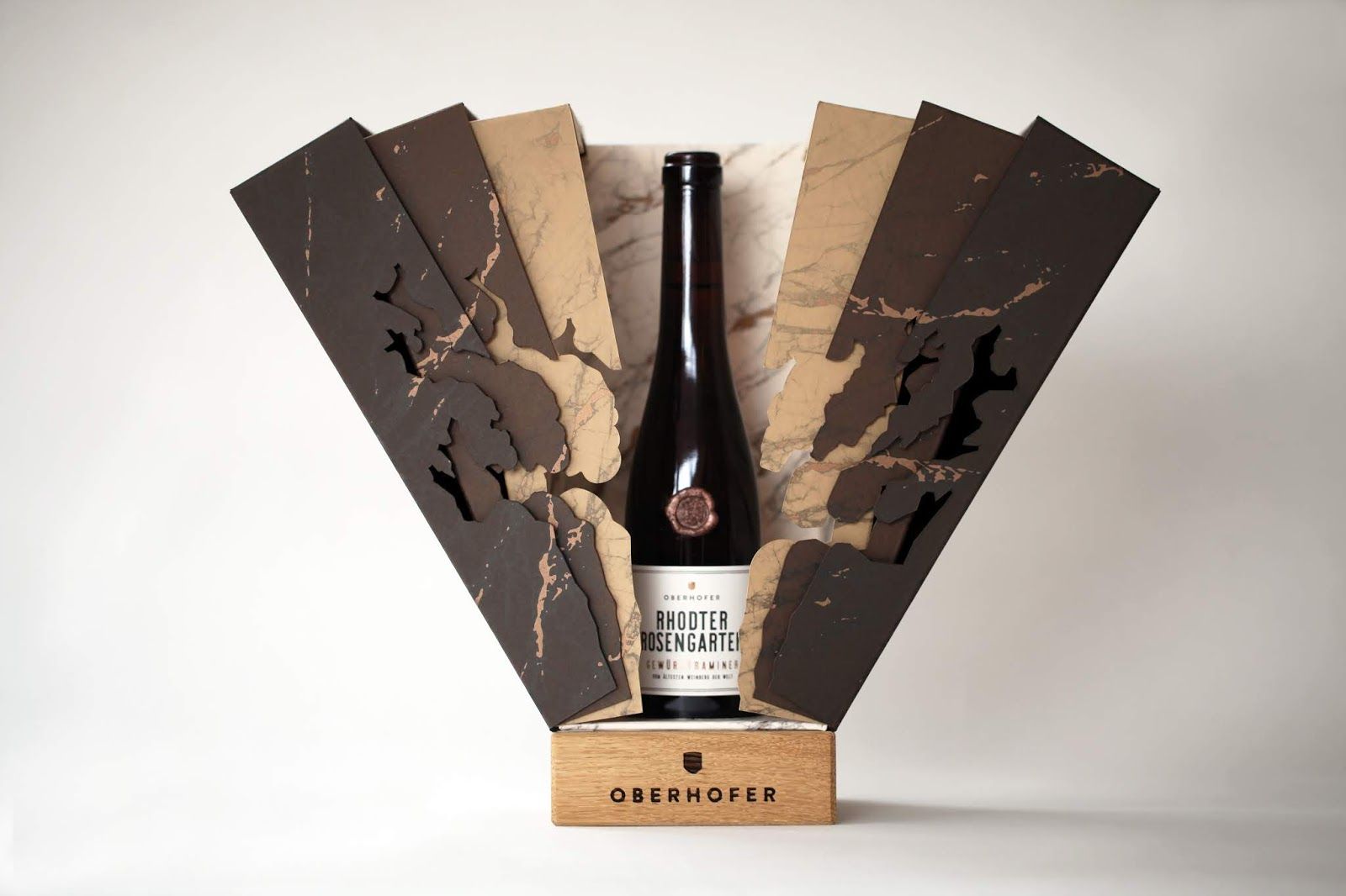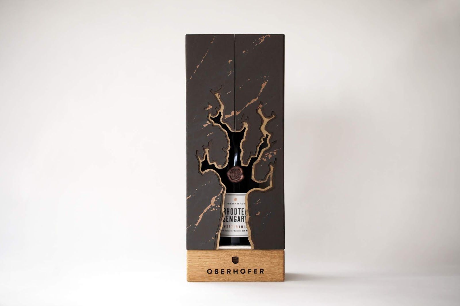 OBERHOFER德國(guó)紅酒包裝盒設(shè)計(jì),外型似一顆樹(shù),包裝的形狀與酒莊的葡萄園有關(guān),這款酒包裝設(shè)計(jì)的最大特點(diǎn)是打開(kāi)時(shí)展開(kāi)的效果,3層特種紙打開(kāi)包裝時(shí)像一把折扇。底座的木塊不是一次性的,它像一個(gè)獎(jiǎng)杯,非常有儀式感。印刷工藝:鋁箔沖壓