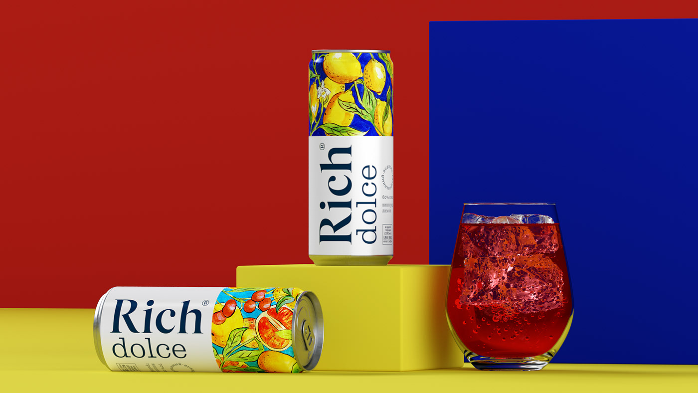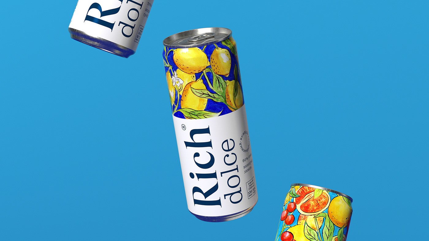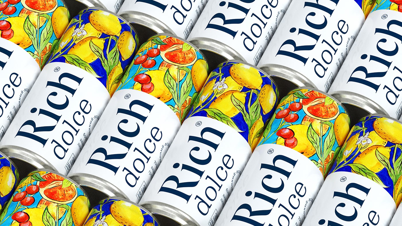 設(shè)計(jì)簡報(bào)果汁和花蜜品牌Rich推出了一種名為Rich Dolce的新產(chǎn)品,這是天然碳酸果汁飲料氣泡系列中的第一款產(chǎn)品。受意大利南部傳統(tǒng)的啟發(fā),Rich Dolce飲料含有高達(dá)70%的水果和漿果汁、水和泡沫,不添加糖。該產(chǎn)品有兩種口味:酸葡萄柚甜櫻桃和清爽的檸檬。創(chuàng)造一個(gè)視覺形象,反映簡潔和豐富的飲料性質(zhì),并顯示明亮的意大利性格。解決方案在開發(fā)設(shè)計(jì)的過程中,團(tuán)隊(duì)希望創(chuàng)造一個(gè)明亮、相關(guān)的解決方案,突出這種飲料并展示其優(yōu)勢。 大的標(biāo)志可以很容易地識(shí)別里奇品牌,這是果汁中公認(rèn)的質(zhì)量標(biāo)志?!癉olce”字體指的是具有歷史意義的19世紀(jì)克拉倫登字體。弗蘭創(chuàng)造的克拉倫登圖形公司(Clarendon Graphic)的ois Rappaud是這種類型字體的一種新的圖形方法,體現(xiàn)了它的現(xiàn)代主義潛力。泡泡線上有一個(gè)圓形標(biāo)志。 黃色和藍(lán)色/紅色和藍(lán)色的對(duì)比組合使其引人注目,明亮的藝術(shù)插圖參考了托斯卡納majolica的傳統(tǒng),讓人們感受到意大利的精神。