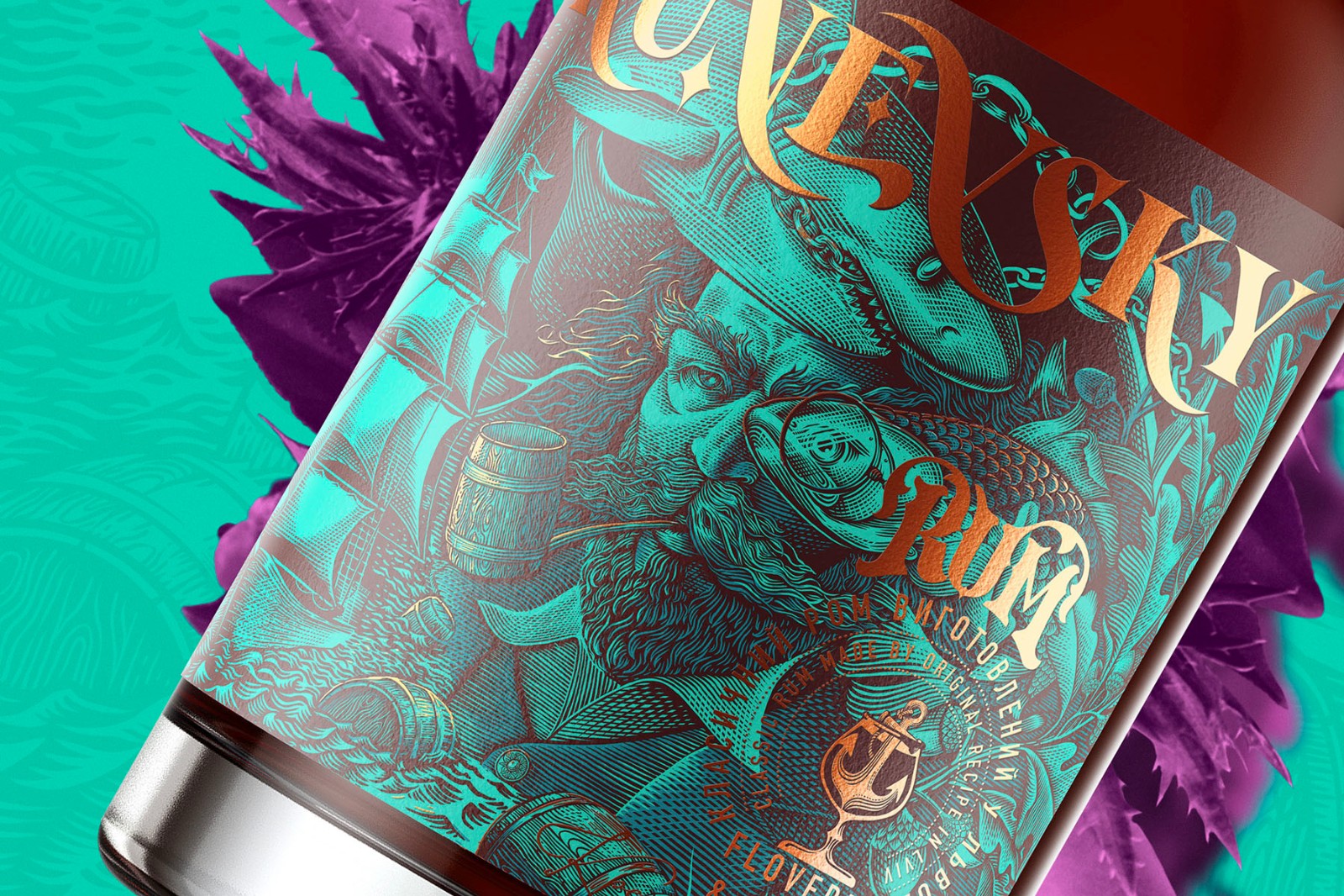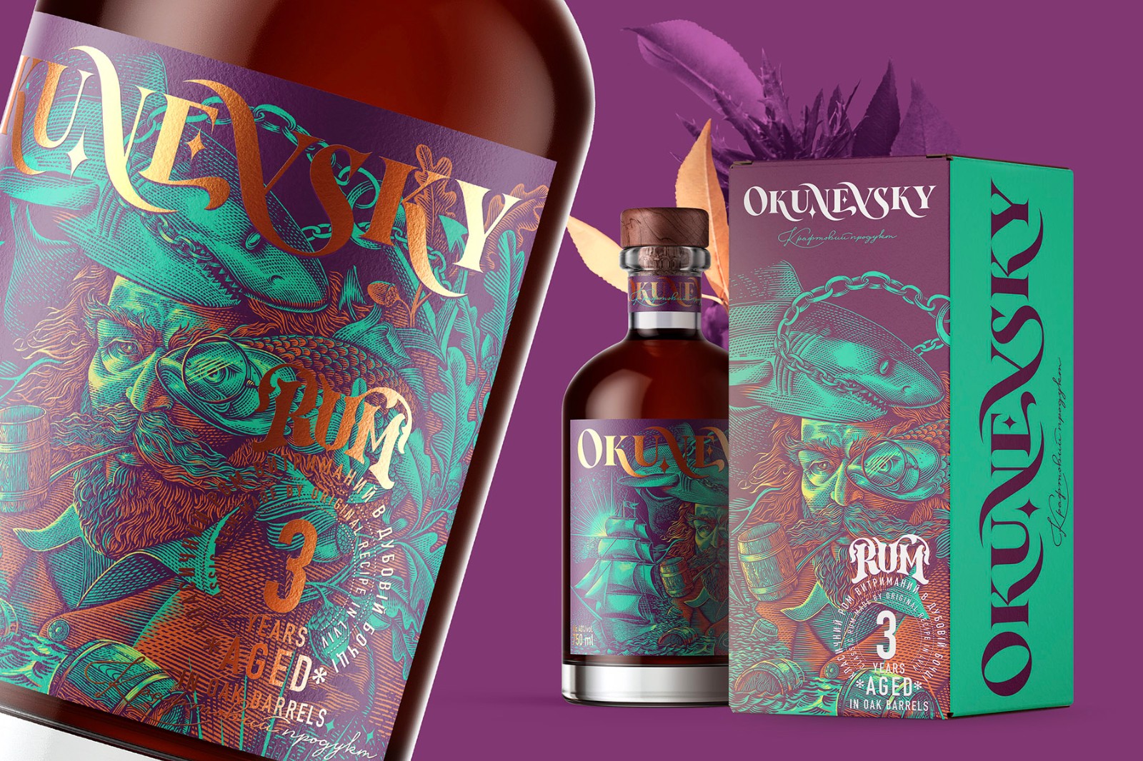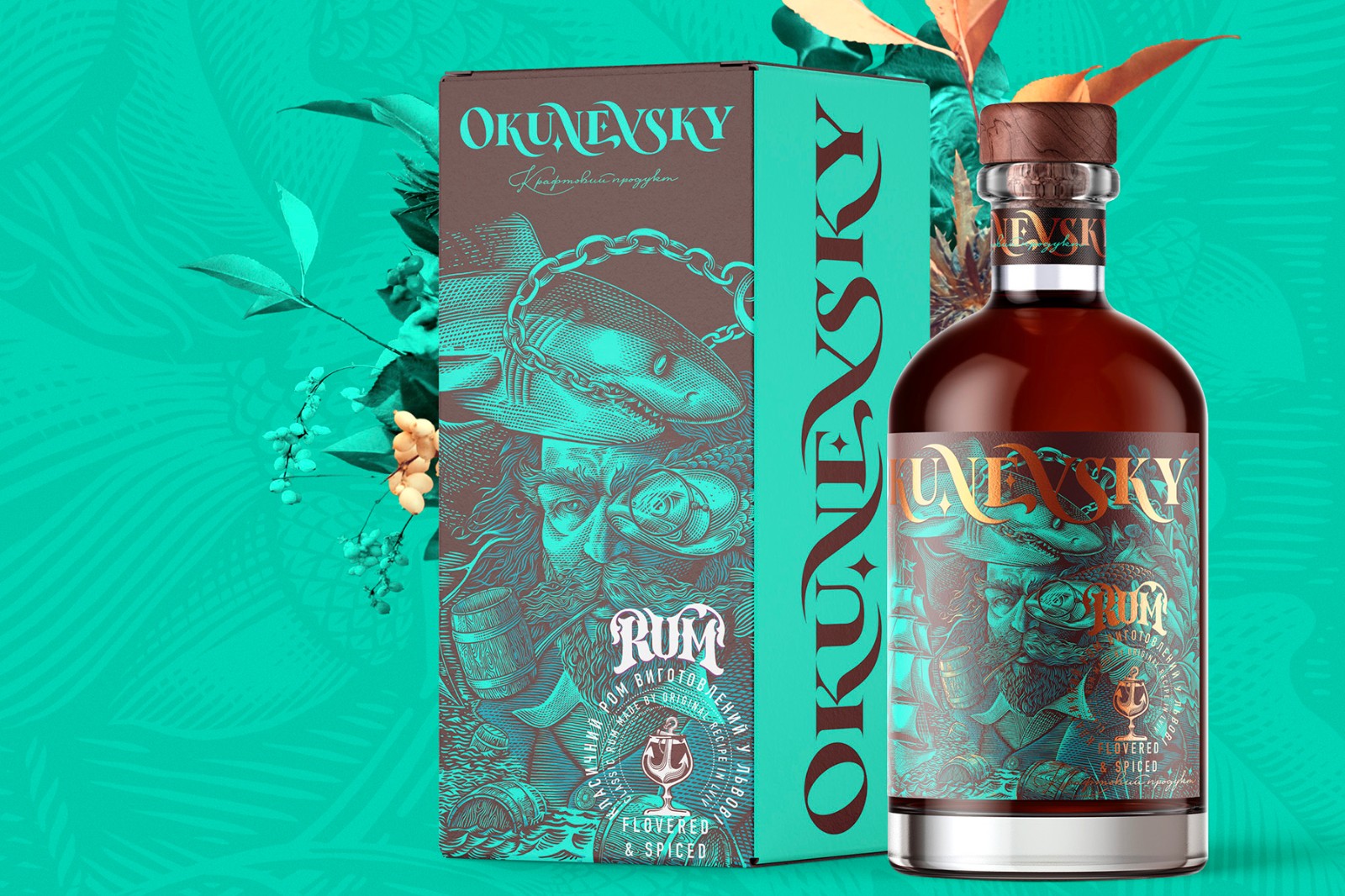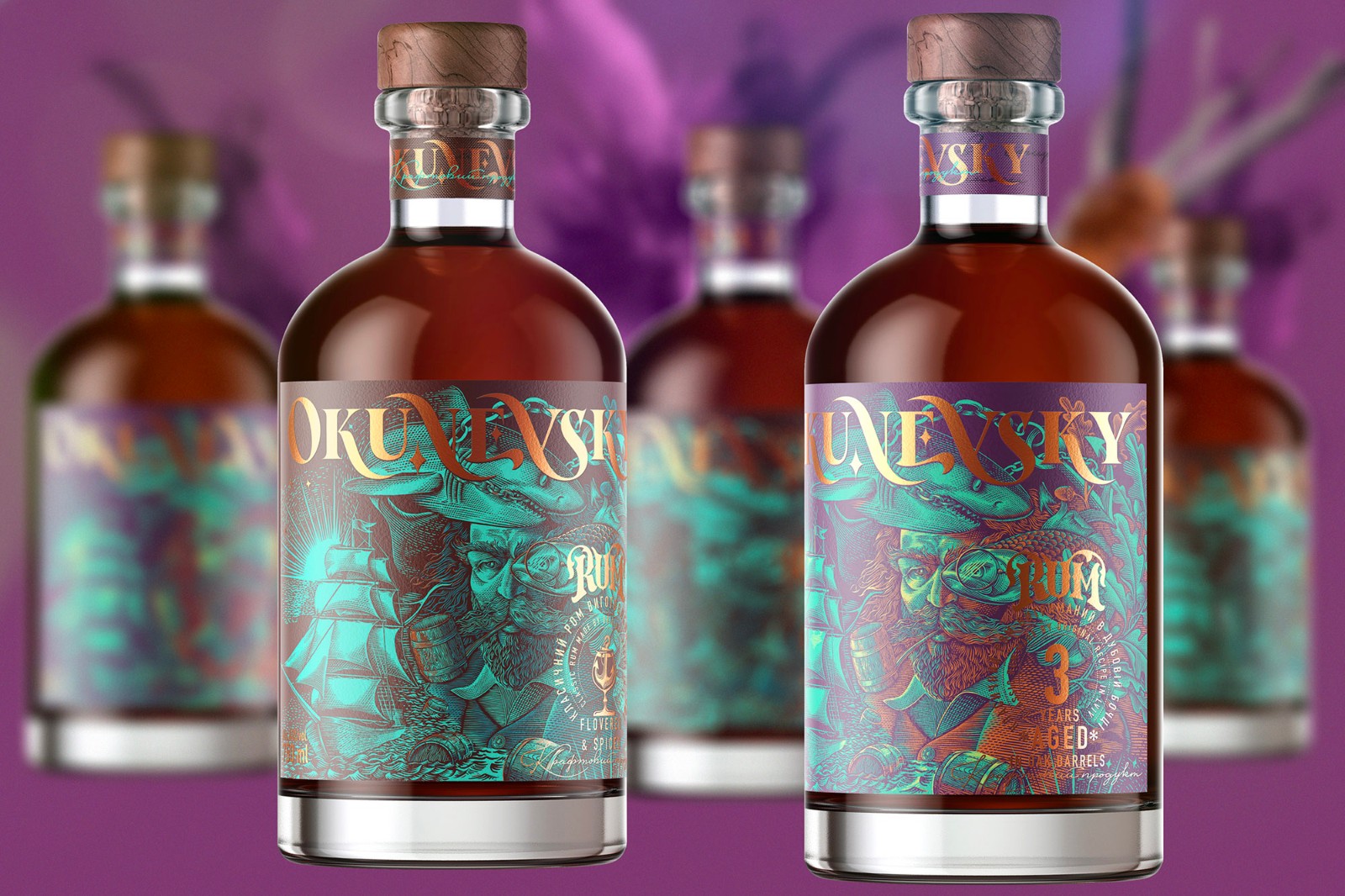 Okunevsky是在烏克蘭利沃夫制造的經(jīng)典朗姆酒的新品牌。這是完全手工制作的產(chǎn)品,分批生產(chǎn),非常注重產(chǎn)品質(zhì)量。該品牌以烏克蘭軍事人物雅羅斯拉夫·奧庫涅夫斯基(Yaroslav Okunevsky)的名字命名,該插畫有些夸張,充滿力量的航海氣氛,有些傳奇般的色彩引起了人們的注意,并在品牌周圍產(chǎn)生了些許神秘感。