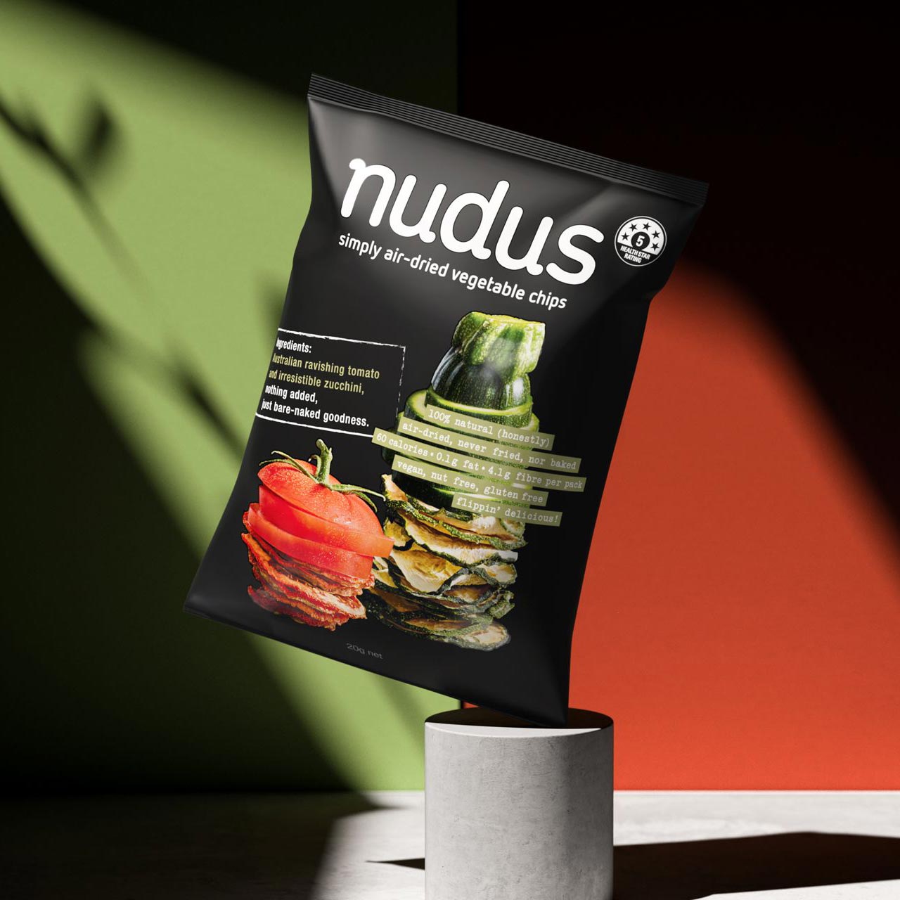 我們?yōu)槌鮿?chuàng)公司Nudus提供的產(chǎn)品包裝和品牌精美展示了這些健康的果蔬脆片的“裸裸美善”理念和有趣的幽默感。