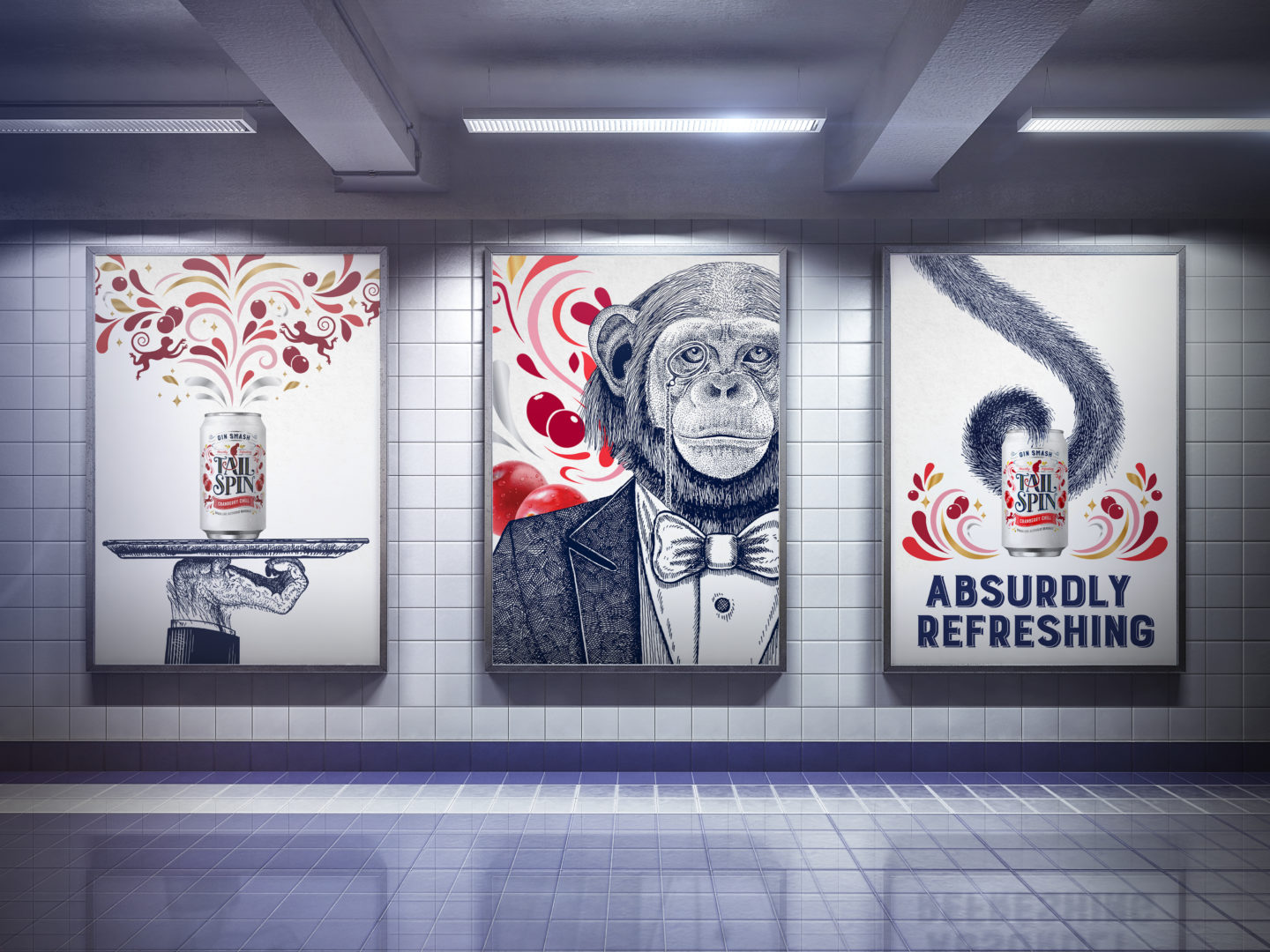 Tail-Spin采用了許多緊張的白酒品牌的標(biāo)志性形式和工藝,并將其轉(zhuǎn)變?yōu)橐粋€瘋狂的杜松子酒聯(lián)合。手繪商標(biāo)周圍是多汁的花絲和飛濺的香味,表達清新的味道爆發(fā)。我們厚顏無恥的猴子的尾巴完成了橫桿的“A”,而他的朋友繼續(xù)通過框架風(fēng)味橫幅黨。這是一個荒謬的令人耳目一新的轉(zhuǎn)變,打破了今天陳腐的貨架現(xiàn)成的飲料供應(yīng)。