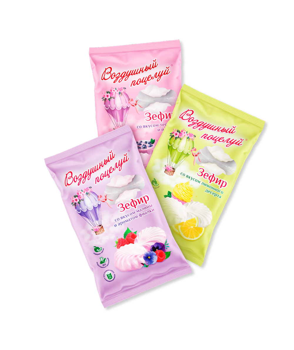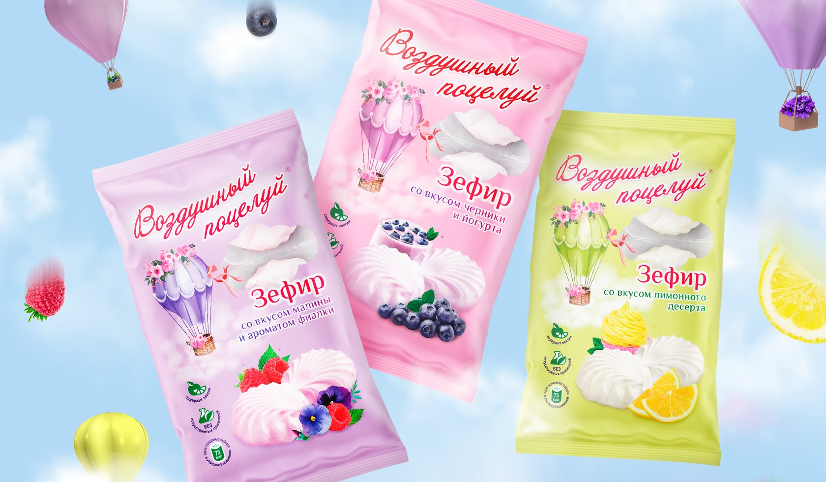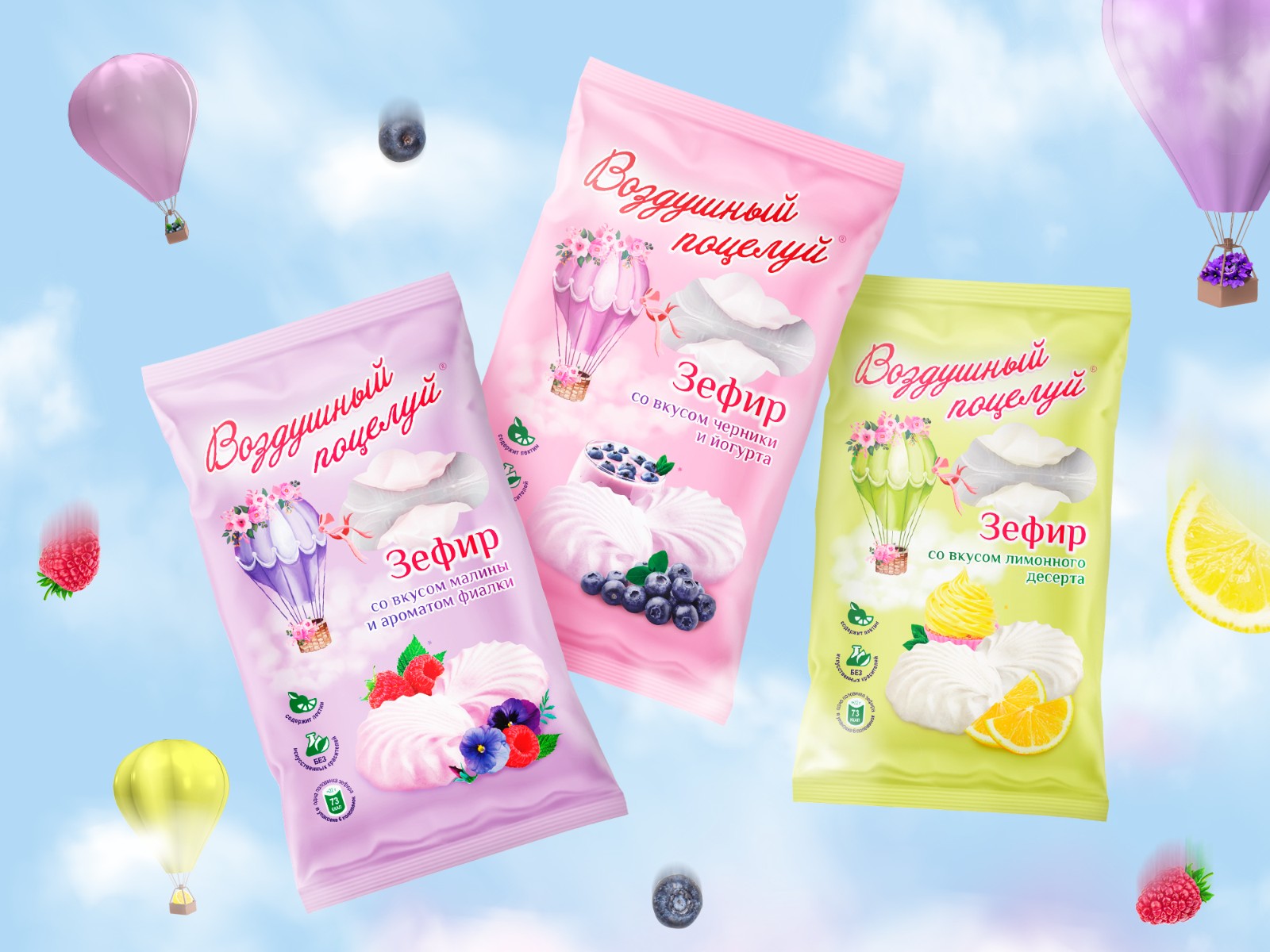 三種口味的棉花糖系列 Air Kiss 的包裝設(shè)計:Sormovskaya Confectionary Factory 品牌的覆盆子紫羅蘭、檸檬甜點、藍(lán)莓酸奶。