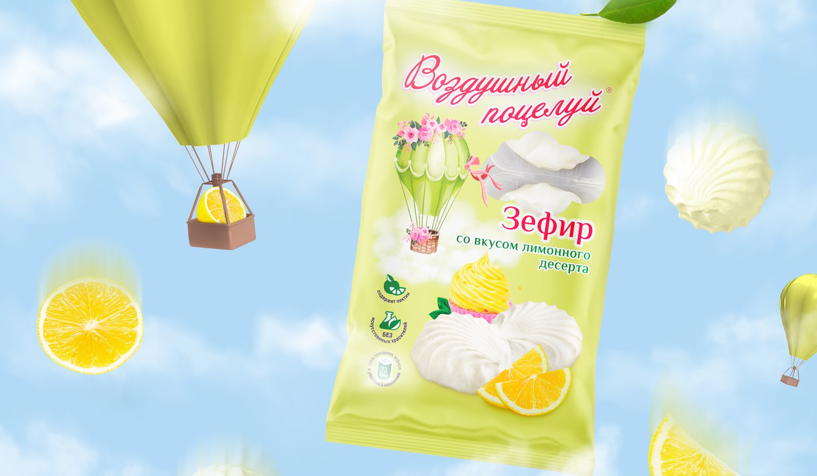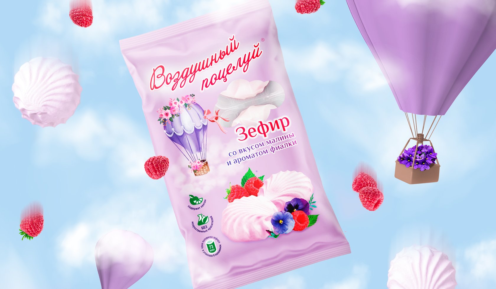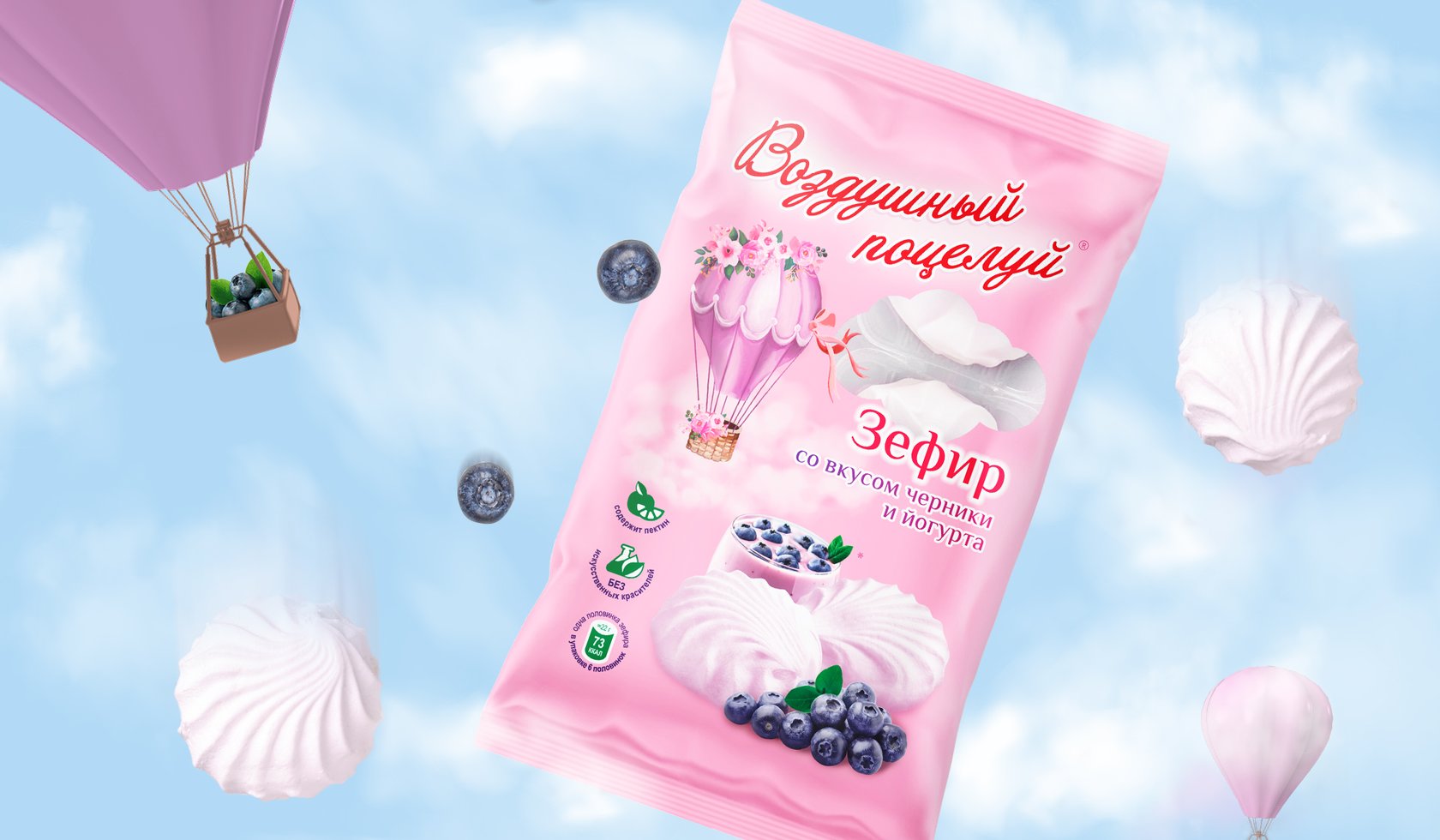 糖果系列的一個特點是為那些想要嘗試新事物的人提供不同尋常的原始口味。因此,對于口味的顏色識別,選擇多汁、歡快但不太鮮艷的顏色,以保持產(chǎn)品的柔軟和柔嫩的感覺。我們開發(fā)了 Air Kiss 系列名稱的風(fēng)格,強(qiáng)調(diào)浪漫和俏皮的心情。作者在背景上繪制的氣球和柔和的云彩的插圖為整體構(gòu)圖增添了輕盈和柔情。